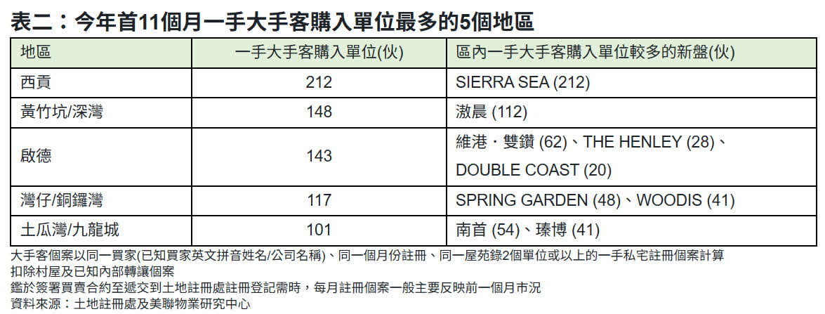對於大手客重臨,岑頌謙指出,雖然一手大手客明顯增多,但是相信以長線投資部署為主。首11個月計,一手大手客成交亦只佔同期近1.89萬宗一手私宅註冊量約7%左右,顯示目前一手市場以用家主導。