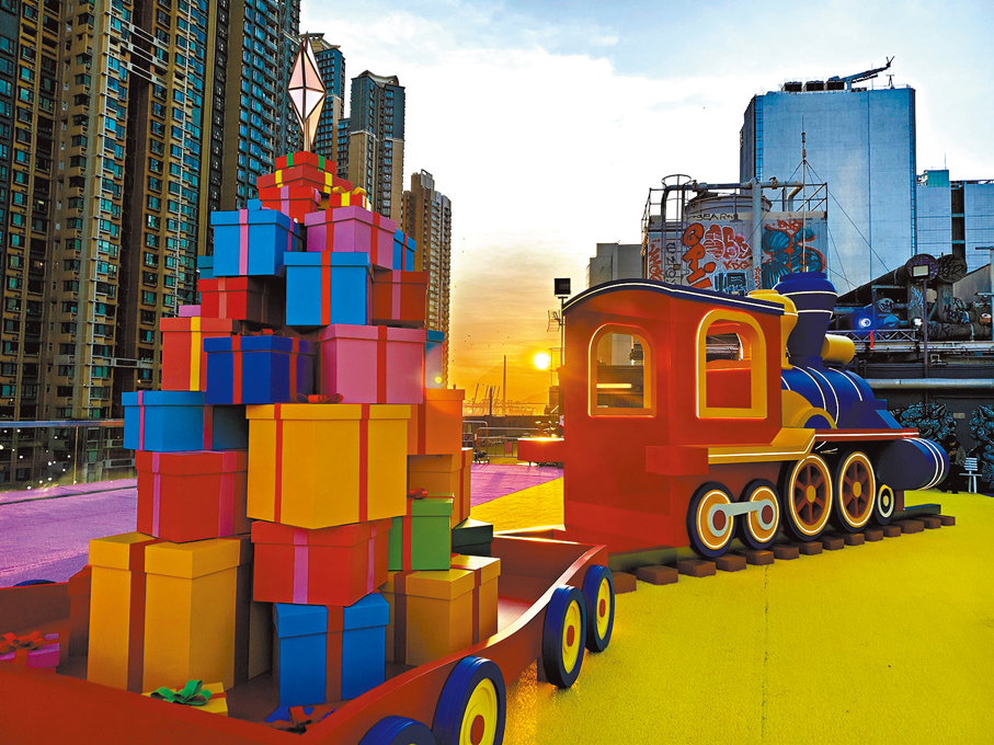 大家可以走進車長室按下鳴笛聲,還原駕駛火車的獨特體驗,搭配另一衝擊眼球的3.5米高玩具聖誕樹,告別傳統聖誕樹造型,樹身以無數繽紛的玩具禮盒堆砌而成,白天歡樂滿載,晚上熠熠生輝。發光拱門車卡與多個巨型玩具打卡位散布天台花園,日與夜各有特色,在璀璨燈飾映照下,營造出既夢幻又充滿童趣的節日氛圍。