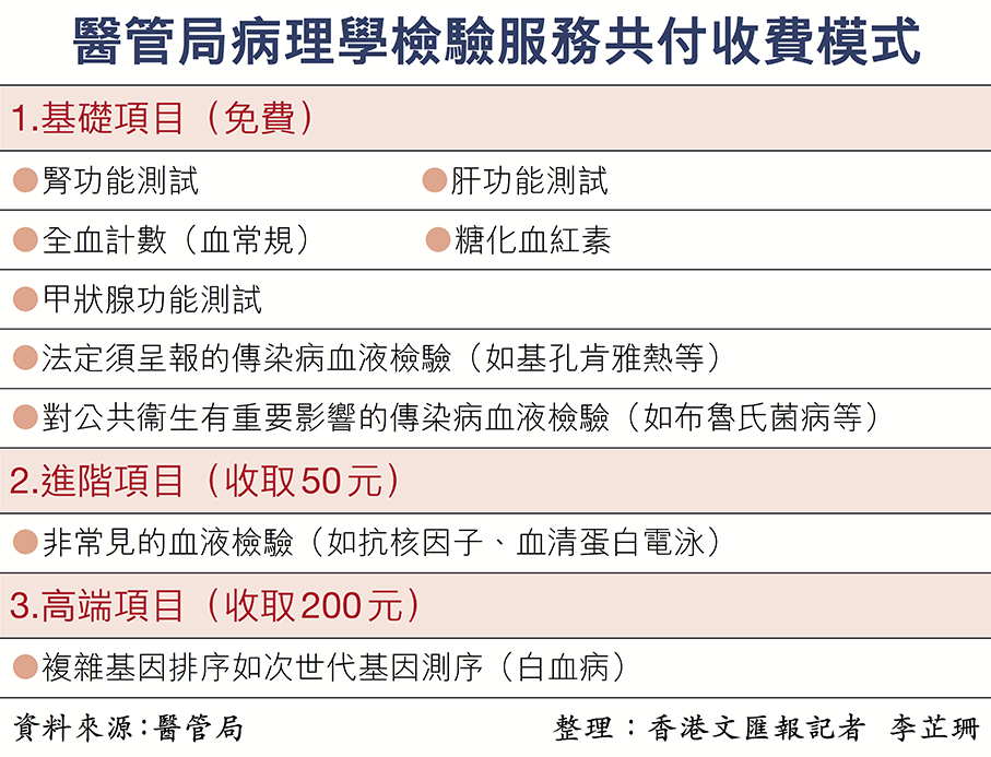 醫管局質素及安全總監黃立己昨日在記者會上介紹3個等級的收費制度:第一級為免費基礎項目,包括最常見的血液病理學檢驗,以及所有非血液病理學檢驗,滿足大多數臨床診斷和治療基本需求;第二級的進階項目收費50元,涵蓋非常見的血液檢驗;高端項目收費200元,包含複雜的基因血液檢驗。