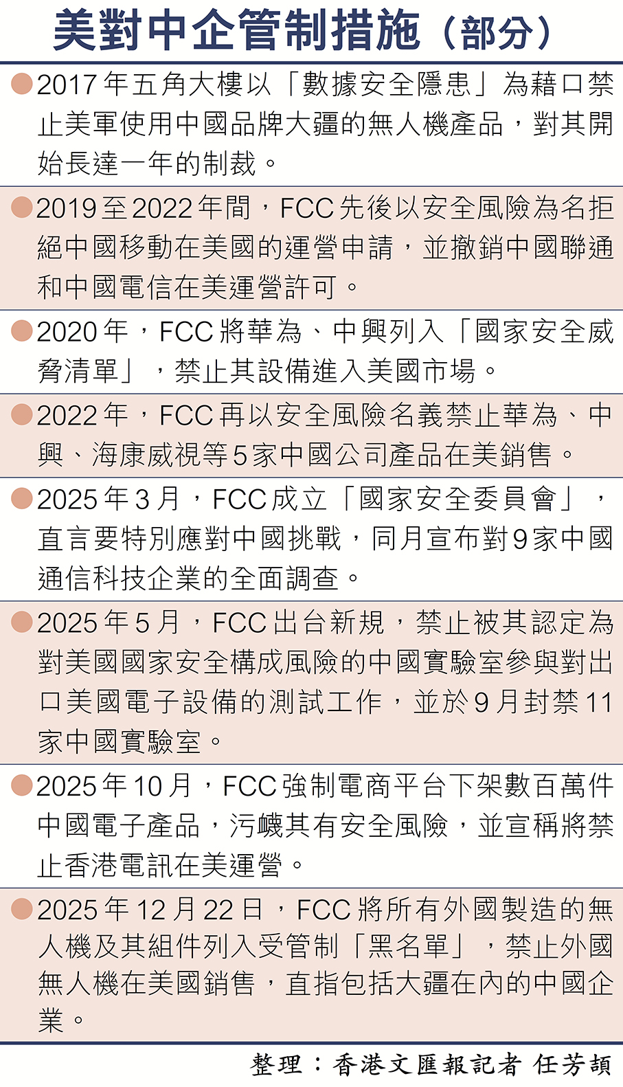 「FCC此舉本質是藉安全之名實施貿易保護,不僅針對性打壓包括中國在內的多國優勢產業,更嚴重擾亂全球市場規則與產業鏈秩序。」全國工商聯執委、91科技集團董事長許澤瑋接受香港文匯報採訪時表示,美方所謂「國家安全」指控毫無實質證據支撐,純屬單邊主義藉口。從行業實踐看,以大疆為代表的外國無人機企業產品,安全性與可靠性已通過全球多家權威第三方機構驗證,且廣泛應用於農業、消防救援等民用領域,為美方相關行業提升效率、保障公共安全發揮了重要作用。將民用產品泛安全化解讀,實則是為本土產業清除競爭障礙,這與美方標榜的「開放公平競爭」原則背道而馳。