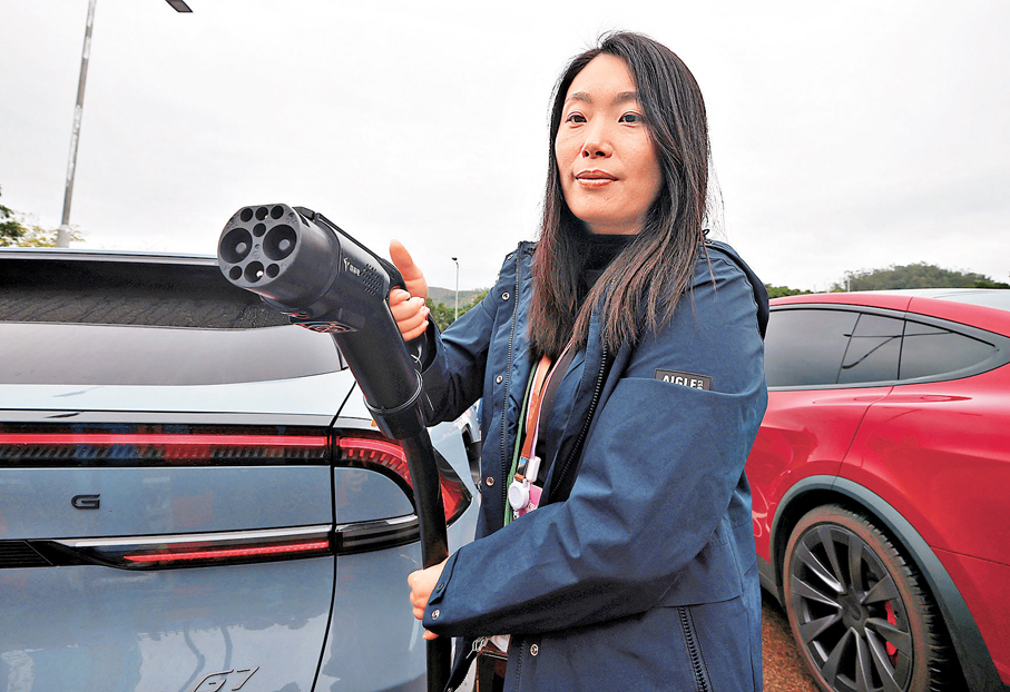 從廣州番禺來的郭靜怡:今次是首次自駕來港,大嶼山充電站設有免觸式出入閘系統,充電及支付流程簡單,速度亦非常快,我們在資訊中心找到不少香港旅遊資訊,整個安排非常貼心周到。●香港文匯報記者郭木又 攝