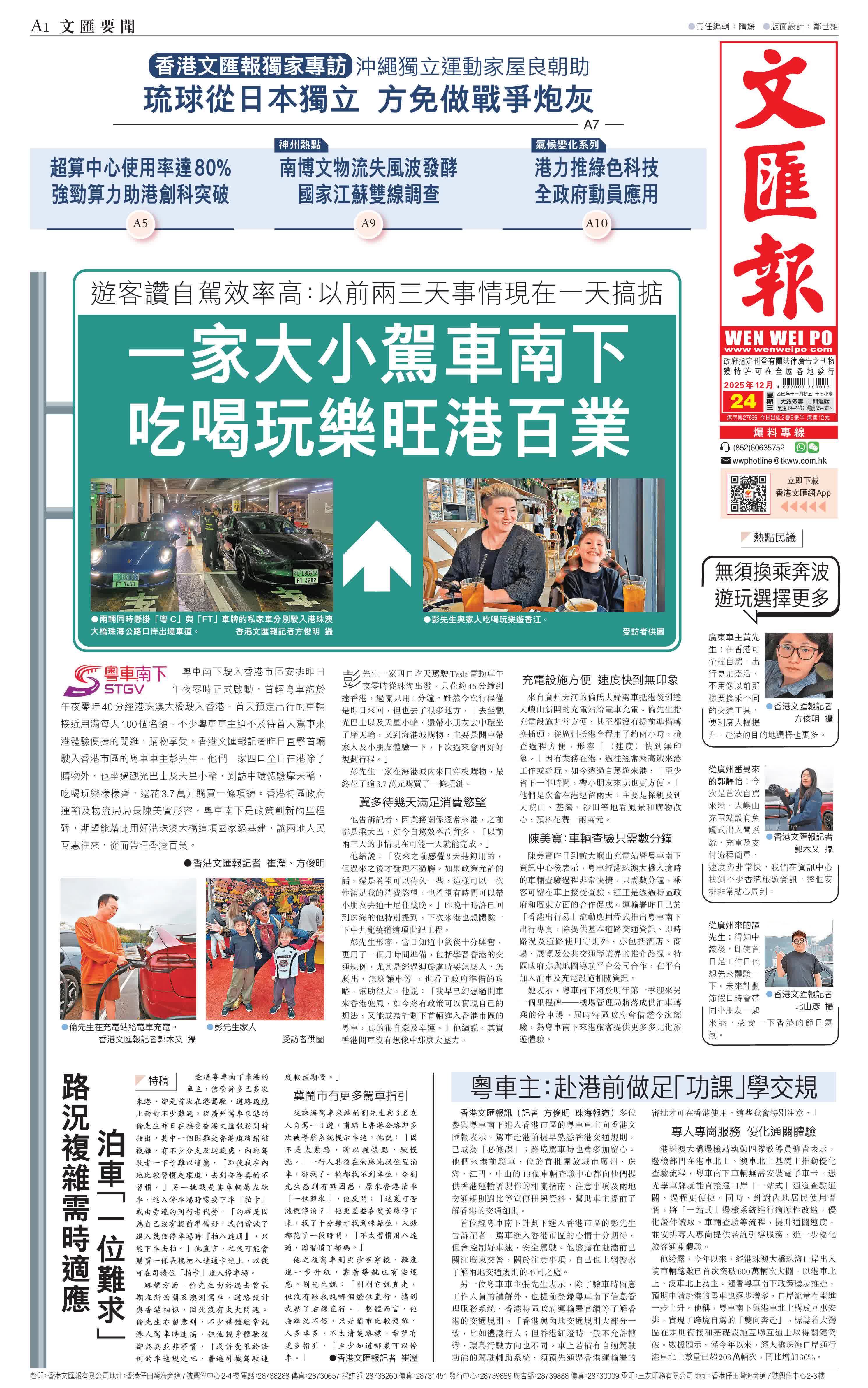 彭先生一家四口昨天駕駛Tesla電動車午夜零時從珠海出發,只花約45分鐘到達香港,過關只用1分鐘。雖然今次行程僅是即日來回,但也去了很多地方,「去坐觀光巴士以及天星小輪,還帶小朋友去中環坐了摩天輪,又到海港城購物,主要是開車帶家人及小朋友體驗一下,下次過來會再好好規劃行程。」