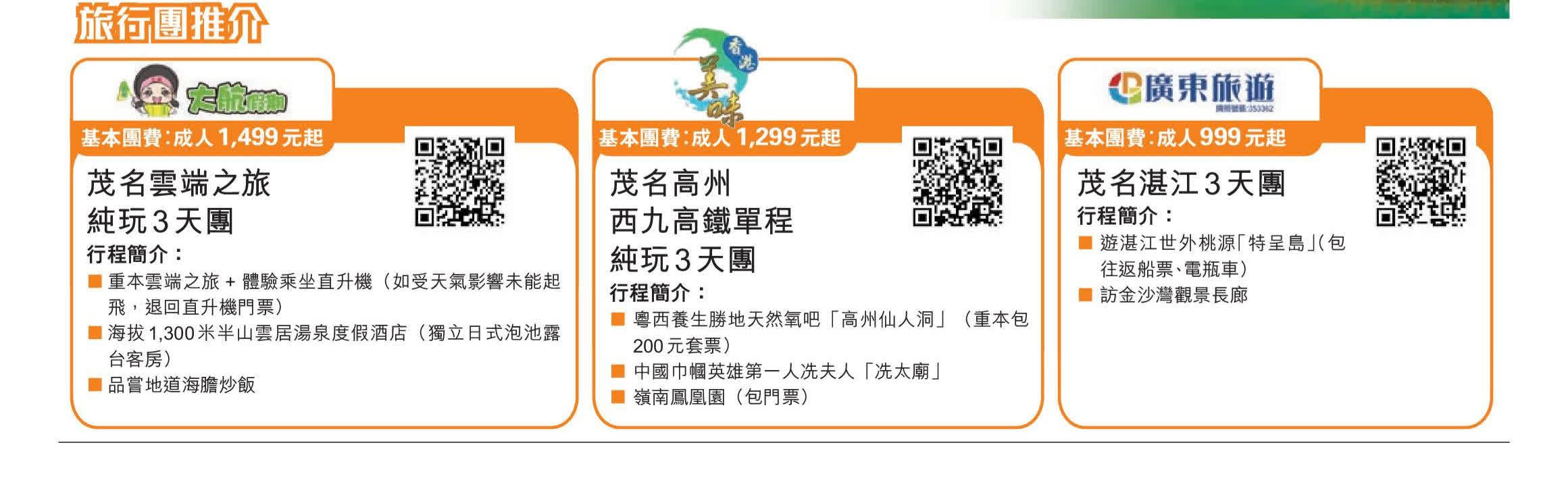 香港開辦的旅行團方面,大航假期「茂名雲端之旅純玩3天團」,最大賣點是在條件許可下,重本安排團友乘坐直升機翱翔天際,親身感受低空旅遊;保證入住高達海拔1,300米的「半山雲居湯泉度假酒店」,享受一晚獨立日式泡池露台客房;美味假期的「茂名高州西九高鐵單程純玩3天團」,玩盡「高州仙人洞」,安排在景區欣賞「天外飛仙真人SHOW」、遠觀「天河大瀑布」,並朝聖歷史古蹟、中國巾幗英雄第一人冼夫人「冼太廟」。另一方面,廣東旅遊的「茂名湛江3天團」, 遊覽湛江世外桃園「特呈島」,欣賞紅樹林、白沙灘。