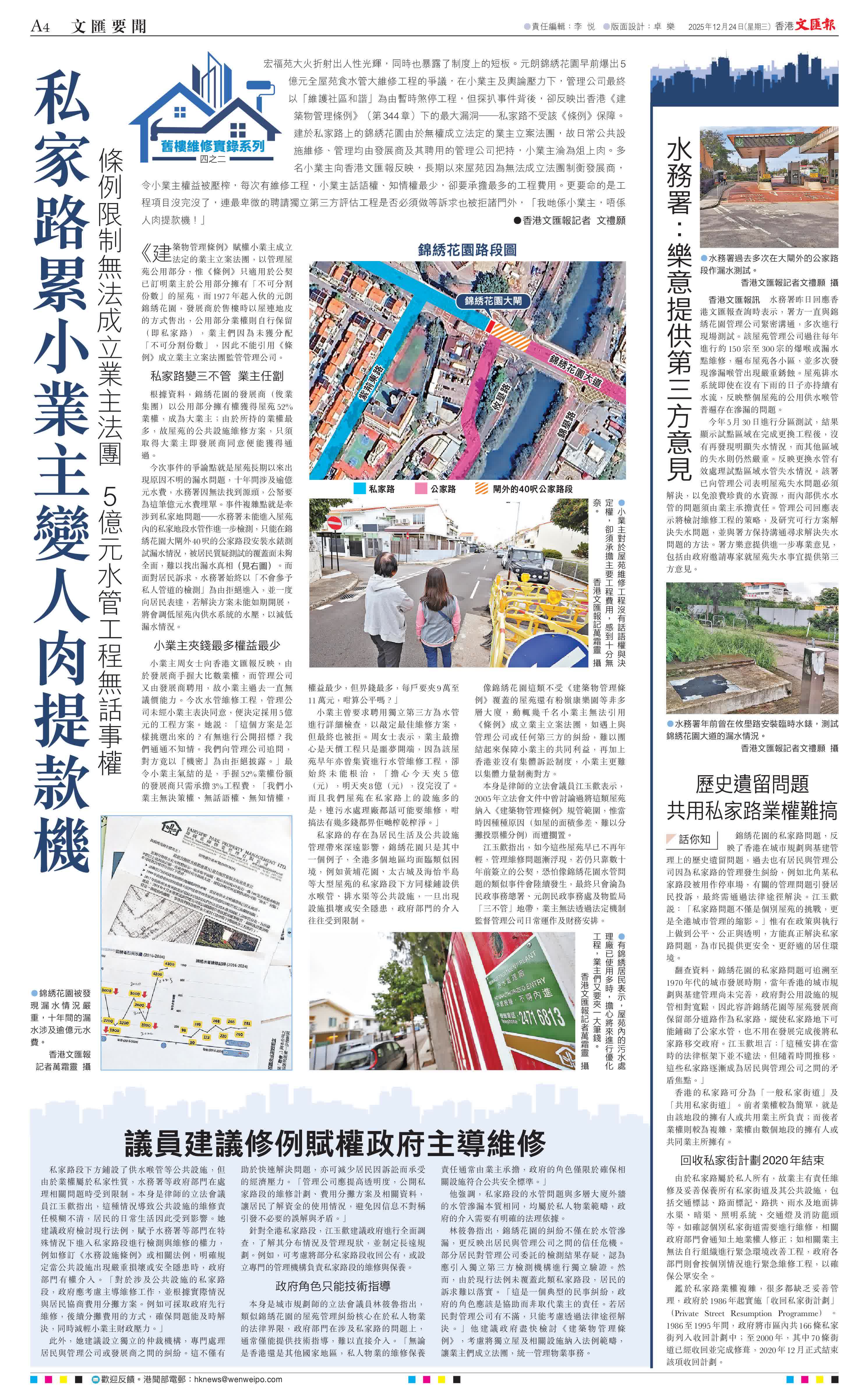 (香港文匯報記者 文禮願)宏福苑大火折射出人性光輝,同時也暴露了制度上的短板。元朗錦綉花園早前爆出5億元全屋苑食水管大維修工程的爭議,在小業主及輿論壓力下,管理公司最終以「維護社區和諧」為由暫時煞停工程,但深扒事件背後,卻反映出香港《建築物管理條例》(第344章)下的最大漏洞──私家路不受該《條例》保障。建於私家路上的錦綉花園由於無權成立法定的業主立案法團,故日常公共設施維修、管理均由發展商及其聘用的管理公司把持,小業主淪為俎上肉。多名小業主向香港文匯報反映,長期以來屋苑因為無法成立法團制衡發展商,令小業主權益被壓榨,每次有維修工程,小業主話語權、知情權最少,卻要承擔最多的工程費用。更要命的是工程項目沒完沒了,連最卑微的聘請獨立第三方評估工程是否必須做等訴求也被拒諸門外,「我哋係小業主,唔係人肉提款機!」