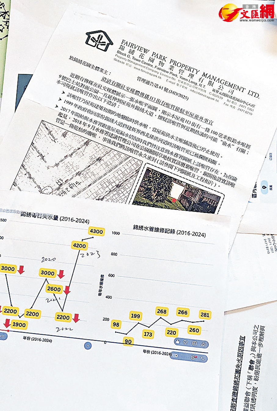 水務署昨日回應香港文匯報查詢時表示,署方一直與錦綉花園管理公司緊密溝通,多次進行現場測試。該屋苑管理公司過往每年進行約150宗至300宗的爆喉或漏水點維修,遍布屋苑各小區,並多次發現滲漏喉管出現嚴重銹蝕。屋苑排水系統即使在沒有下雨的日子亦持續有水流,反映整個屋苑的公用供水喉管普遍存在滲漏的問題。
