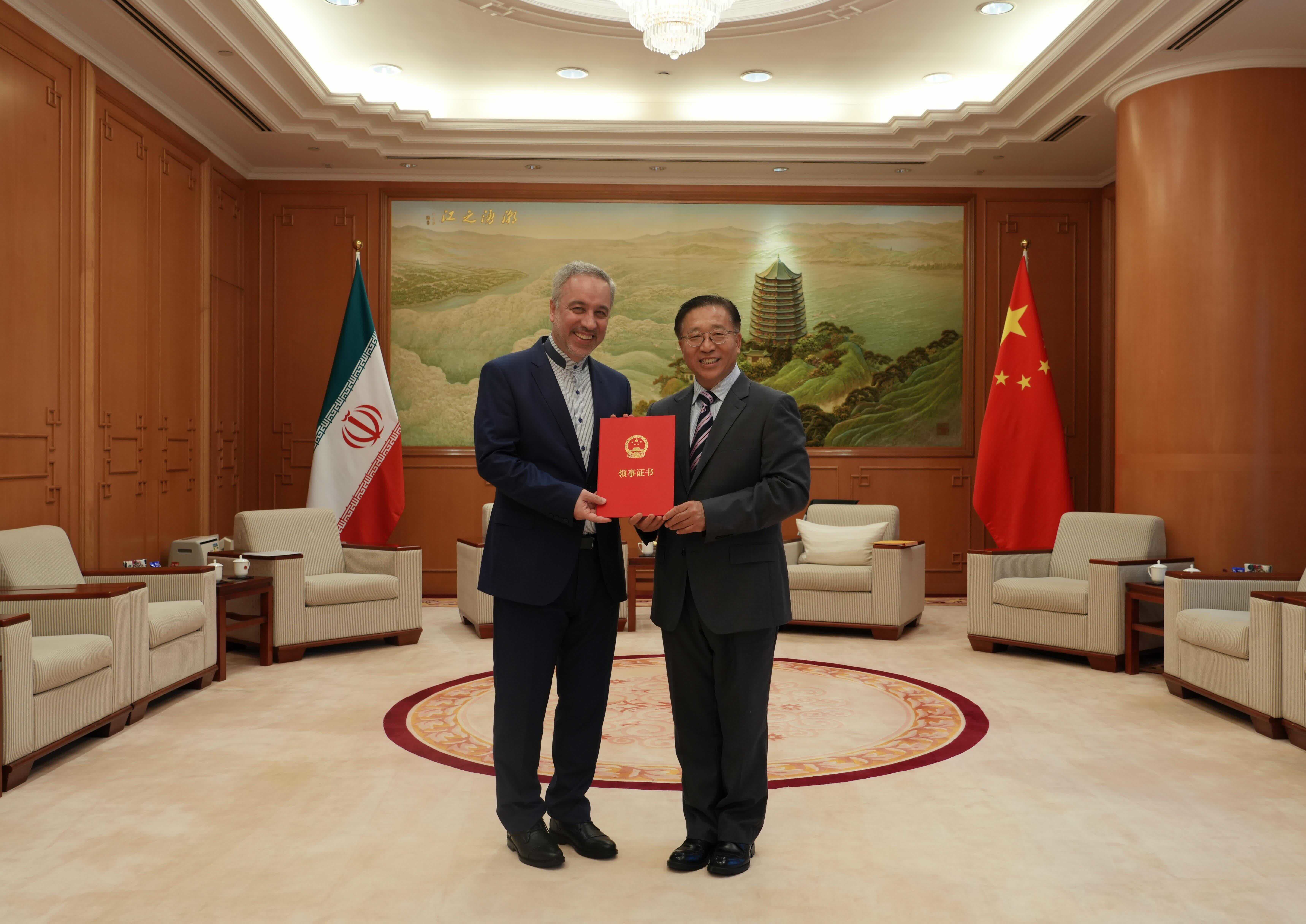 崔建春向杜塔吉總領事頒發《領事證書》,宣介黨的二十屆四中全會精神,介紹「一國兩制」在港成功實踐和香港融入國家發展大局的嶄新機遇,期待其為進一步加強伊朗在香港各領域交流合作作出積極貢獻。