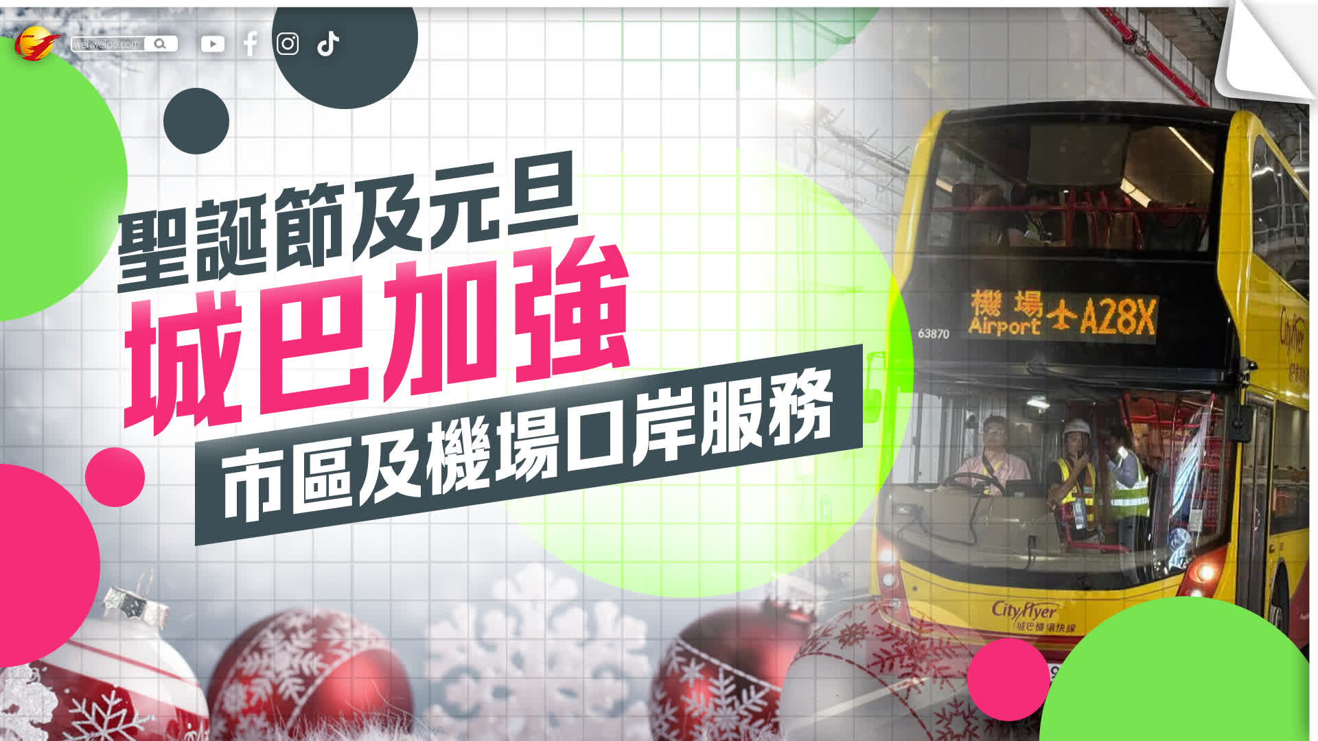 至於首條取道中九龍繞道的機場巴士路線 ── 城巴機場快線A28X,自本周一(22日)開通以來,深受將軍澳及日出康城居民歡迎。受惠近年兩大焦點基建項目將藍公路及中九龍繞道的優勢,由日出康城上車最快45分鐘便可直達機場。城巴經評估乘客於假期外遊對交通服務的需求,決定於聖誕期間及元旦日(12月25至28日及2026年1月1日)加班,為將軍澳及日出康城乘客提供更快、更直接前往機場及港珠澳大橋香港口岸的交通首選。