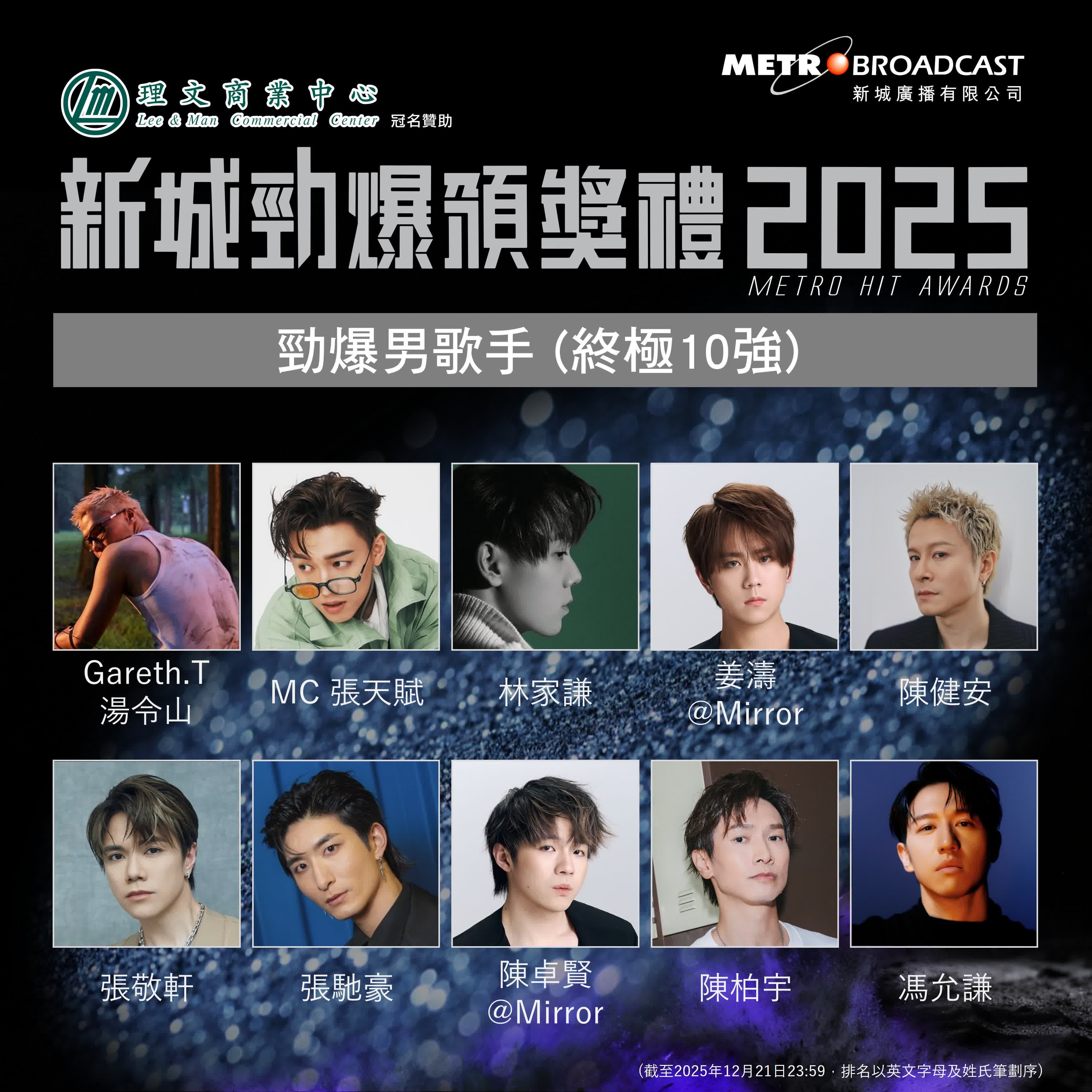 香港文匯報訊(記者 余雁)樂壇盛事《新城勁爆頒獎禮2025》將於12月27日舉行。今年八大獎項的公開投票已全面截止,其中備受關注的「勁爆男、女歌手」獎項,經網民及音統會投票,終極十強名單今日正式揭曉。