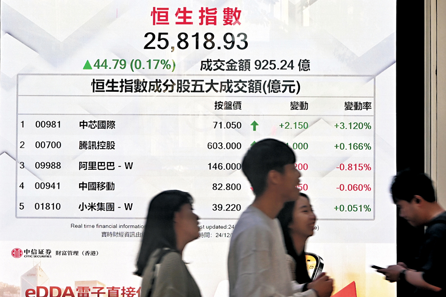 港股於昨日平安夜(24日)只有半日市,恒指高見25,890點,收市報25,818點,升44點或0.17%迎聖誕,主板成交僅925.24億元,當中芯片股中芯國際(0981)因受惠美國延遲加徵關稅而領漲藍籌。滬深三大股指收紅。另外,滙控(0005)早前提出以每股155元私有化恒生銀行(0011),法院會議及股東特別大會將於明年1月8日舉行,兩大獨立投票顧問機構Glass Lewis及ISS均呼籲股東支持方案。