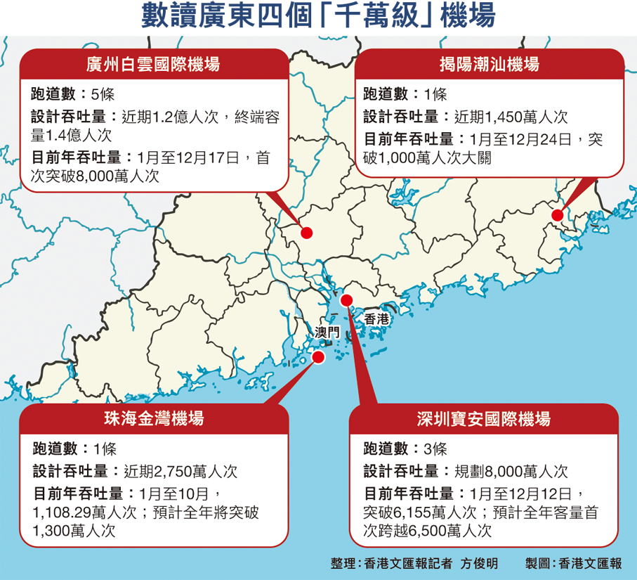 廣東機場集團有關負責人表示,該集團所管理的機場(廣州白雲機場、揭陽潮汕機場、湛江機場、梅州機場、惠州機場、韶關機場)年旅客吞吐量在今年預計首次超過1億人次。該集團將立足廣東省區域協調發展戰略與《粵港澳大灣區發展規劃綱要》部署,結合所管理各機場地理位置、市場需求、資源稟賦及發展現狀等差異化特徵,構建「以大帶小、以小促大」的協同發展格局,實現全省航空資源效能最大化。同時,積極推動粵港澳大灣區世界級機場群和航空產業集群進一步融合發展。