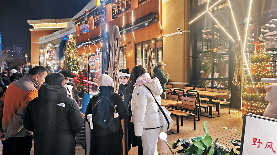 開心果聖誕樹、聖誕曲奇禮盒、紅酒風味美式、甜甜圈聖誕限定……今年聖誕季北京多家商舖湧現出節日氣氛濃厚的限定餐飲,以顏值與口味並存的優勢吸引了不少消費者。而集吃喝玩樂逛一條龍的藍色港灣商圈更是在平安夜迎來餐飲火爆,客流與消費熱度雙雙攀升,成為京城平安夜最具代表性的「煙火氣」聚集地之一。香港文匯報記者現場看到,晚上7點左右每家餐廳都要排隊一小時以上,某韓餐更是排到了店家承接力兩倍之上的人數。