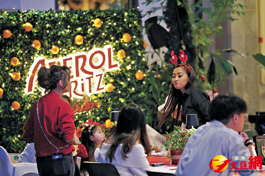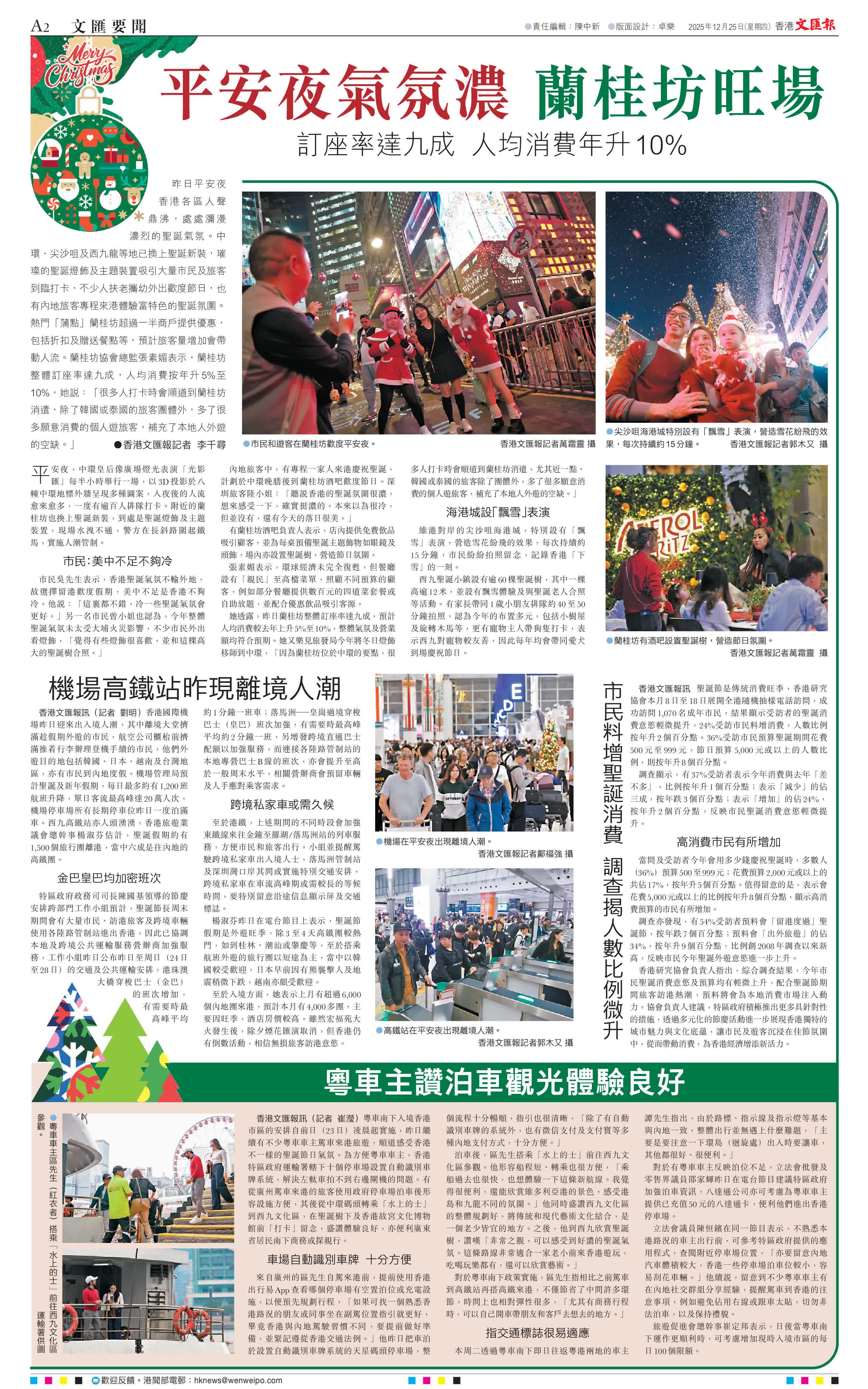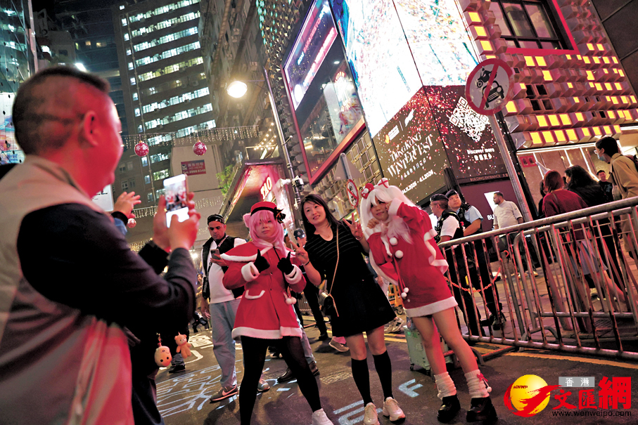 (香港文匯報記者 李千尋)昨日平安夜香港各區人聲鼎沸,處處瀰漫濃烈的聖誕氣氛。中環、尖沙咀及西九龍等地已換上聖誕新裝,璀璨的聖誕燈飾及主題裝置吸引大量市民及旅客到臨打卡,不少人扶老攜幼外出歡度節日,也有內地旅客專程來港體驗富特色的聖誕氛圍。熱門「蒲點」蘭桂坊超過一半商戶提供優惠,包括折扣及贈送餐點等,預計旅客量增加會帶動人流。蘭桂坊協會總監張素媚表示,蘭桂坊整體訂座率達九成,人均消費按年升5%至10%,她說:「很多人打卡時會順道到蘭桂坊消遣,除了韓國或泰國的旅客團體外,多了很多願意消費的個人遊旅客,補充了本地人外遊的空缺。」