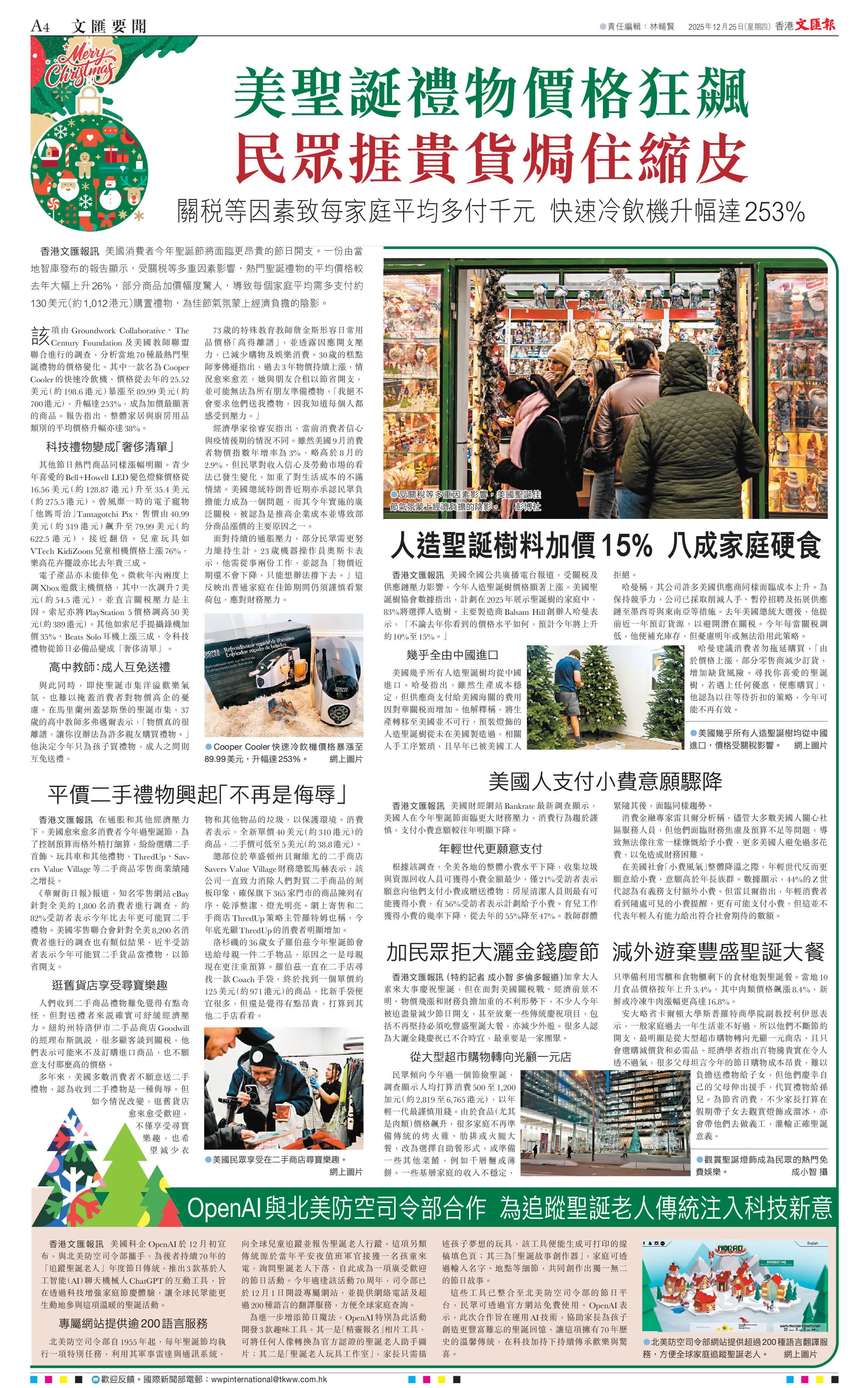 香港文匯報訊 美國消費者今年聖誕節將面臨更昂貴的節日開支。一份由當地智庫發布的報告顯示,受關稅等多重因素影響,熱門聖誕禮物的平均價格較去年大幅上升26%,部分商品加價幅度驚人,導致每個家庭平均需多支付約130美元(約1,012港元)購置禮物,為佳節氣氛蒙上經濟負擔的陰影。