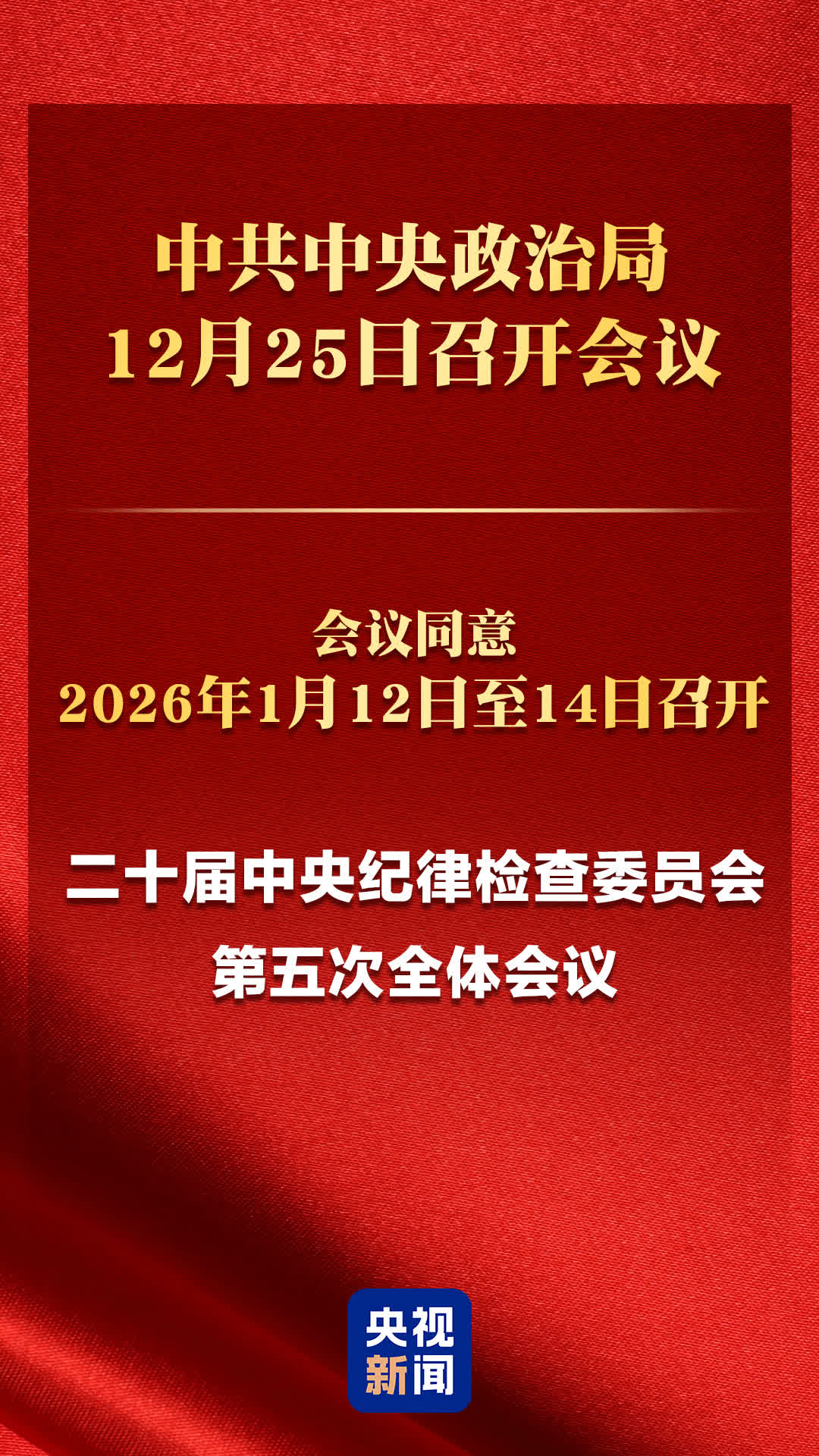據央視新聞報道,中共中央政治局12月25日召開會議,會議同意明年1月12日至14日召開二十屆中央紀律檢查委員會第五次全體會議。