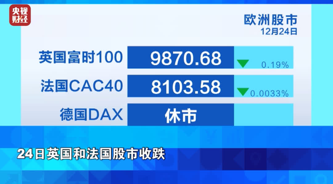 歐洲方面,歐洲部分國家股市休市,多國股市因傳統節假日提前結束交易,市場交投較為清淡,部分零售、非必需消費品藍籌股表現不佳,英國和法國股市收跌,德國股市當天休市。截至收盤,英國股市跌0.19%,法國股市微跌0.0033%。