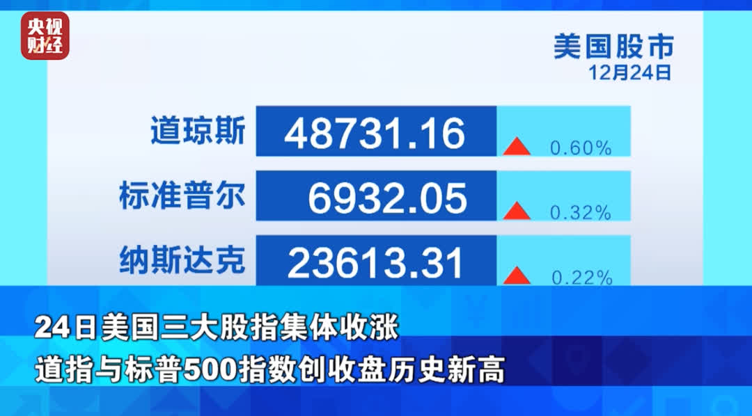 當地時間周三,美國股市因傳統節假日臨近提前結束交易,市場整體交投清淡。反映市場對標普500指數未來波動預期的「恐慌指數」VIX跌至一年來新低,表明投資者對未來短期出現風險事件的擔憂情緒得到緩解。同時,市場仍預計美聯儲明年至少降息兩次,降息預期拉動房地產、金融等周期股普遍上漲,美國三大股指周三集體上漲。截至收盤,道指漲0.60%,標普500指數漲0.32%,納指漲0.22%。其中,道指與標普500指數均創收盤歷史新高。