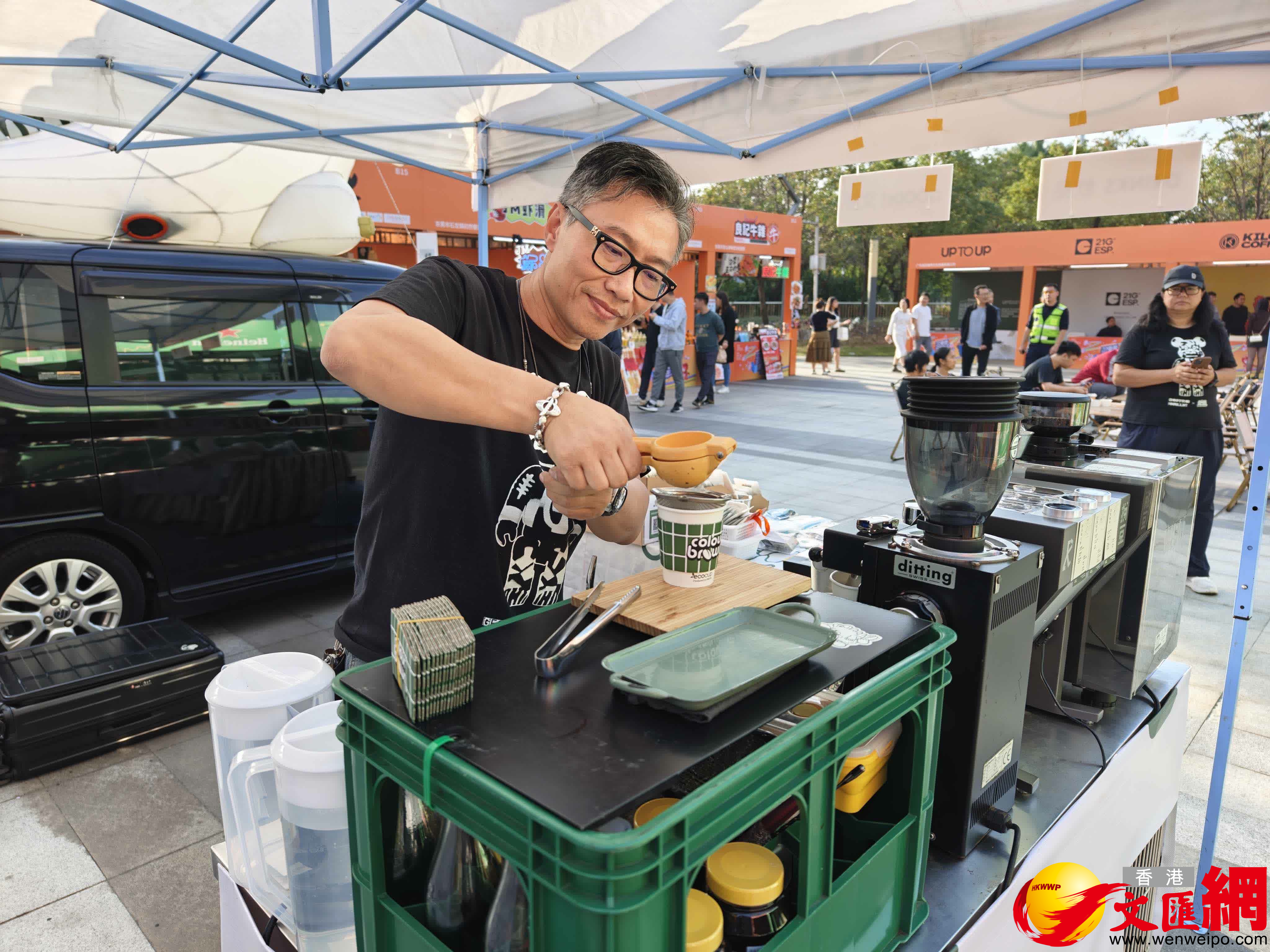 眾多展位中,一個以鈴木麵包車為襯托的咖啡鋪讓人耳目一新。「今天專程從香港開車來東莞擺攤,所有擺攤用的工具和產品都裝在這輛小車裏帶過來。」Colour Brown咖啡品牌主理人李健明介紹,自己在香港有多間咖啡店,此次來東莞參展,為的是了解內地咖啡愛好者的需求。「這些年我都常到內地參加各種咖啡比賽和咖啡市集,感受到內地咖啡文化的蓬勃發展。」他透露,自己這次帶來了不同產地和風味的咖啡豆,還把以自家寵物狗為原型設計的吉祥物冰箱貼展示出來,希望得到內地消費者的認可。李健明坦言,自己仍在不斷學習了解內地咖啡行業的運作模式,未來計劃在大灣區內地城市開一間自己的咖啡館。