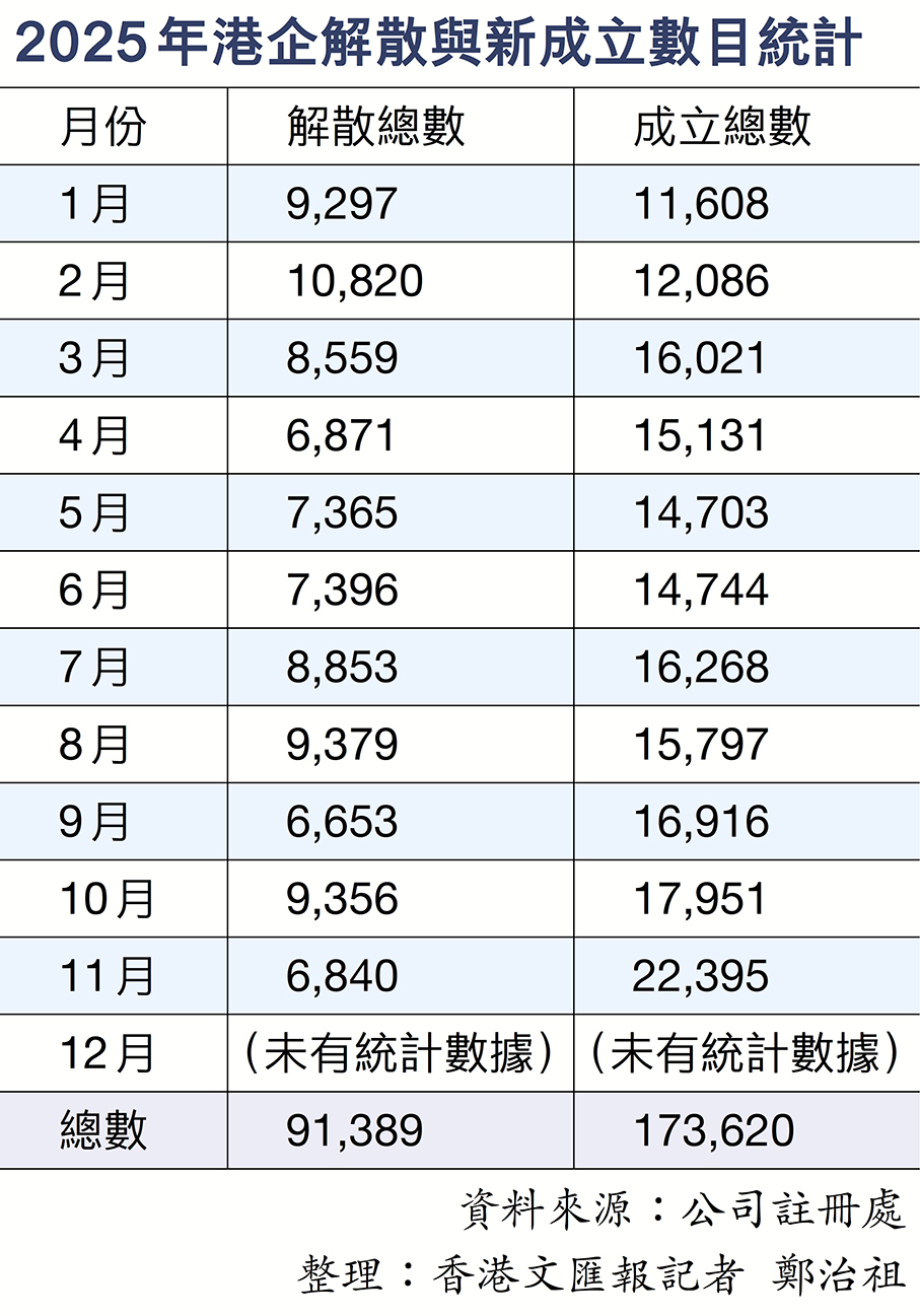 香港過去一年雖然受北上消費熱潮影響,接連有多間連鎖零售及飲食集團結業,失業率一度由年初3.1%攀升至今年7月至9月的3.9%,其間零售業及餐飲服務活動業的失業率,分別由4%及4.7%升至5.3%及6.8%全年高位。解散的公司(見表)也在2月見新高,但新成立的公司數量始終多於解散的公司,顯示市場的樂觀情緒一直多於悲觀。踏入第三季,市況進一步改善,失業率見頂回落至3.8%,零售及飲食業尤其顯著。