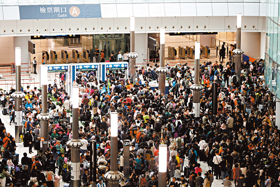 香港文匯報記者昨日在西九龍高鐵站直擊,一早出境大堂已人山人海,大批市民排隊等候過關,人龍排滿整個大堂。票務大堂的熒幕則顯示,多班離港列車的車票均已售罄,僅剩餘候補車票。入境處指出,昨日至晚上9時有6.1萬巿民經西九龍高鐵站出境。