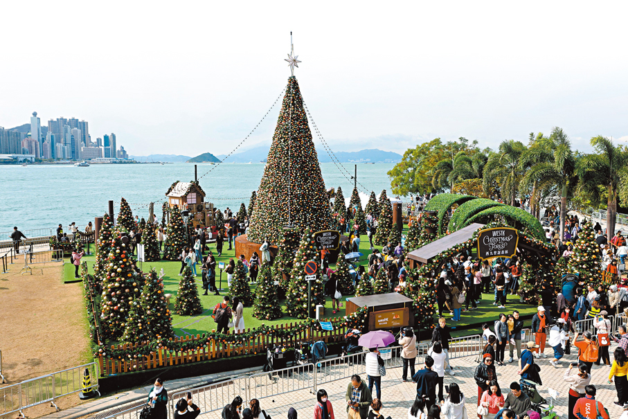 西九文化區今年擺放高逾12米的巨型聖誕樹,吸引大批旅客和巿民到場拍照。來自深圳的旅客王先生專程來港探望在香港讀大學的女友。他興奮地表示,香港聖誕景觀與活動令人印象深刻,展現中西文化交融的都市魅力,商場的聖誕音樂、街道上的燈飾,還有各種聖誕主題市集,讓人沉浸在節日喜悅中,「維港兩岸的燈飾、商場的聖誕裝置較想像中震撼。」他表示會選擇在香港跨年,「深圳來香港太方便,一小時生活圈讓我們可以隨時來過節,跨年再來看倒數。」