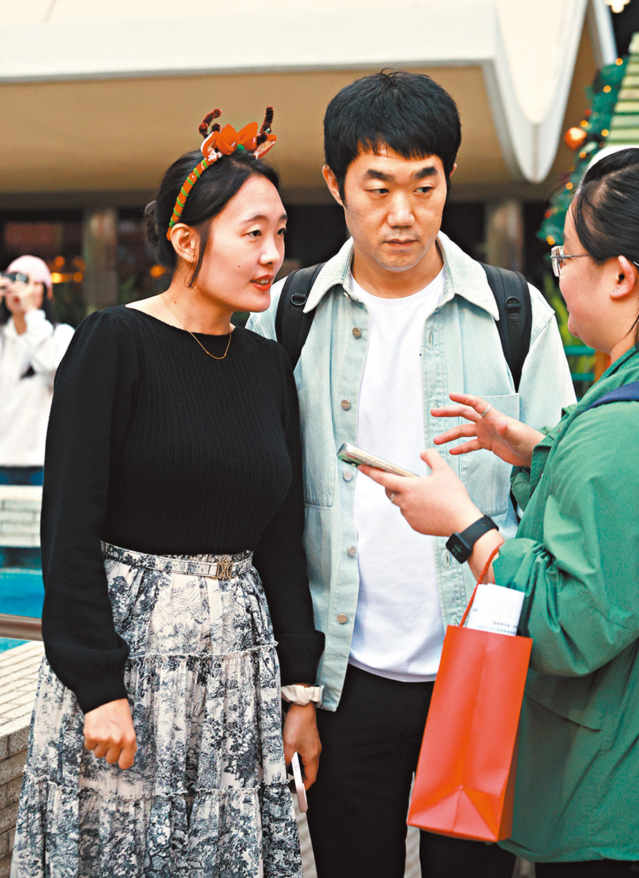除內地旅客外,亦有不少海外旅客訪港,其中來自韓國的Bella與丈夫在港逗留四天,預算花費3,000美元,「網上看到這裏有全球最濃郁的聖誕氛圍,體驗特別好。」他們表示香港最吸引的是氣候,冬天不太冷,其次是有不少聖誕慶典活動,「香港的聖誕裝飾也比韓國好很多,氣氛更濃厚、規模更大。」
