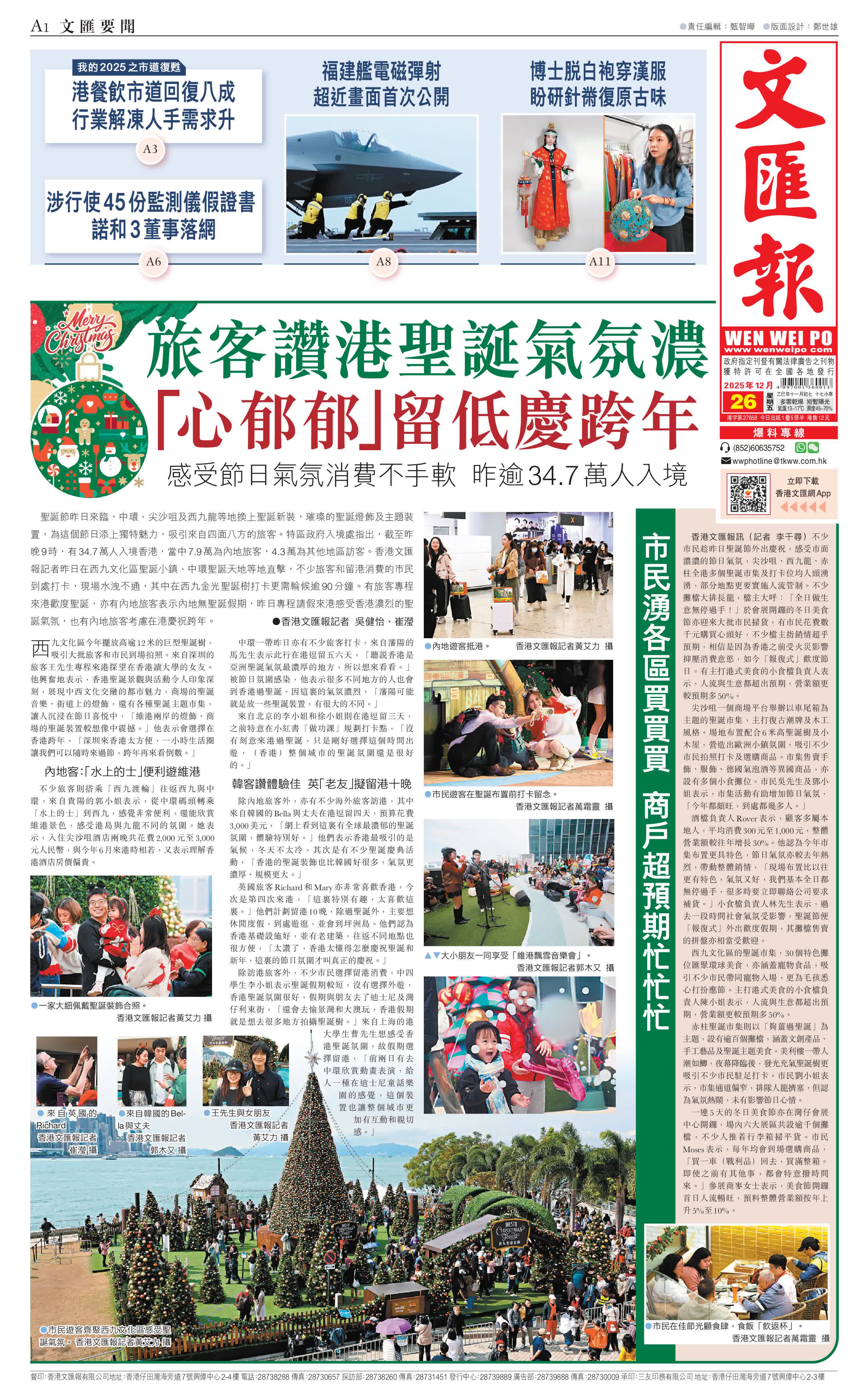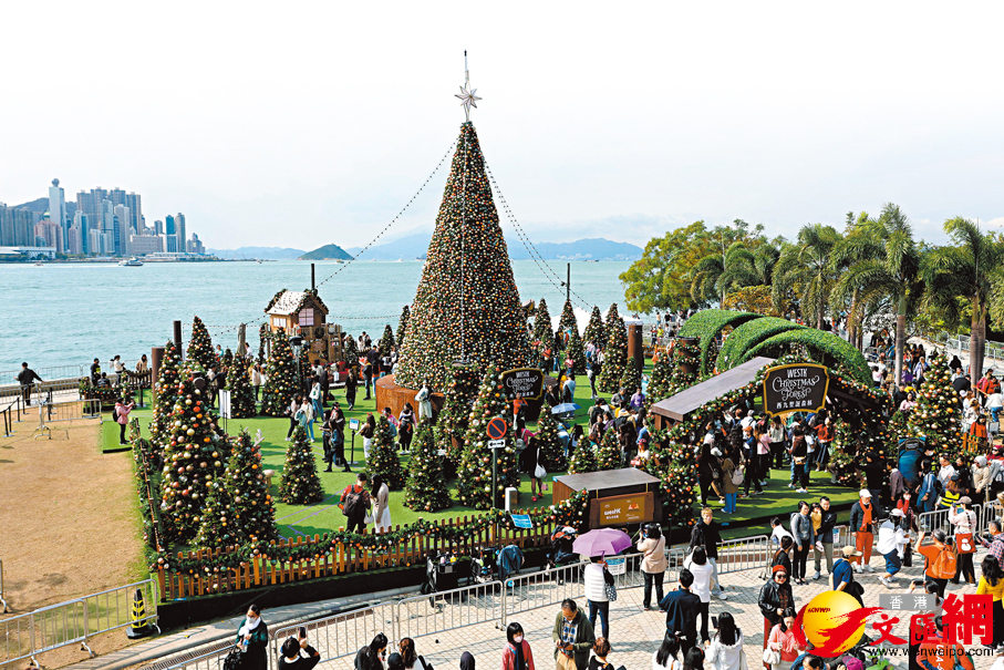(香港文匯報記者 吳健怡、崔瀅)聖誕節昨日來臨,中環、尖沙咀及西九龍等地換上聖誕新裝,璀璨的聖誕燈飾及主題裝置,為這個節日添上獨特魅力,吸引來自四面八方的旅客。特區政府入境處指出,截至昨晚9時,有34.7萬人入境香港,當中7.9萬為內地旅客,4.3萬為其他地區訪客。香港文匯報記者昨日在西九文化區聖誕小鎮、中環聖誕天地等地直擊,不少旅客和留港消費的巿民到處打卡,現場水洩不通,其中在西九金光聖誕樹打卡更需輪候逾90分鐘。有旅客專程來港歡度聖誕,亦有內地旅客表示內地無聖誕假期,昨日專程請假來港感受香港濃烈的聖誕氣氛,也有內地旅客考慮在港慶祝跨年。