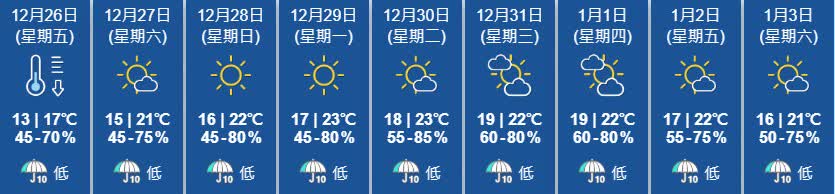 天文台預測本港今日大致多雲,天氣乾燥,日間短暫時間有陽光,最高氣溫約17度,吹和緩至清勁北至東北風。展望周末至下周初天晴,早上仍然清涼,內陸地區日夜溫差頗大,下周中期氣溫稍為回升。