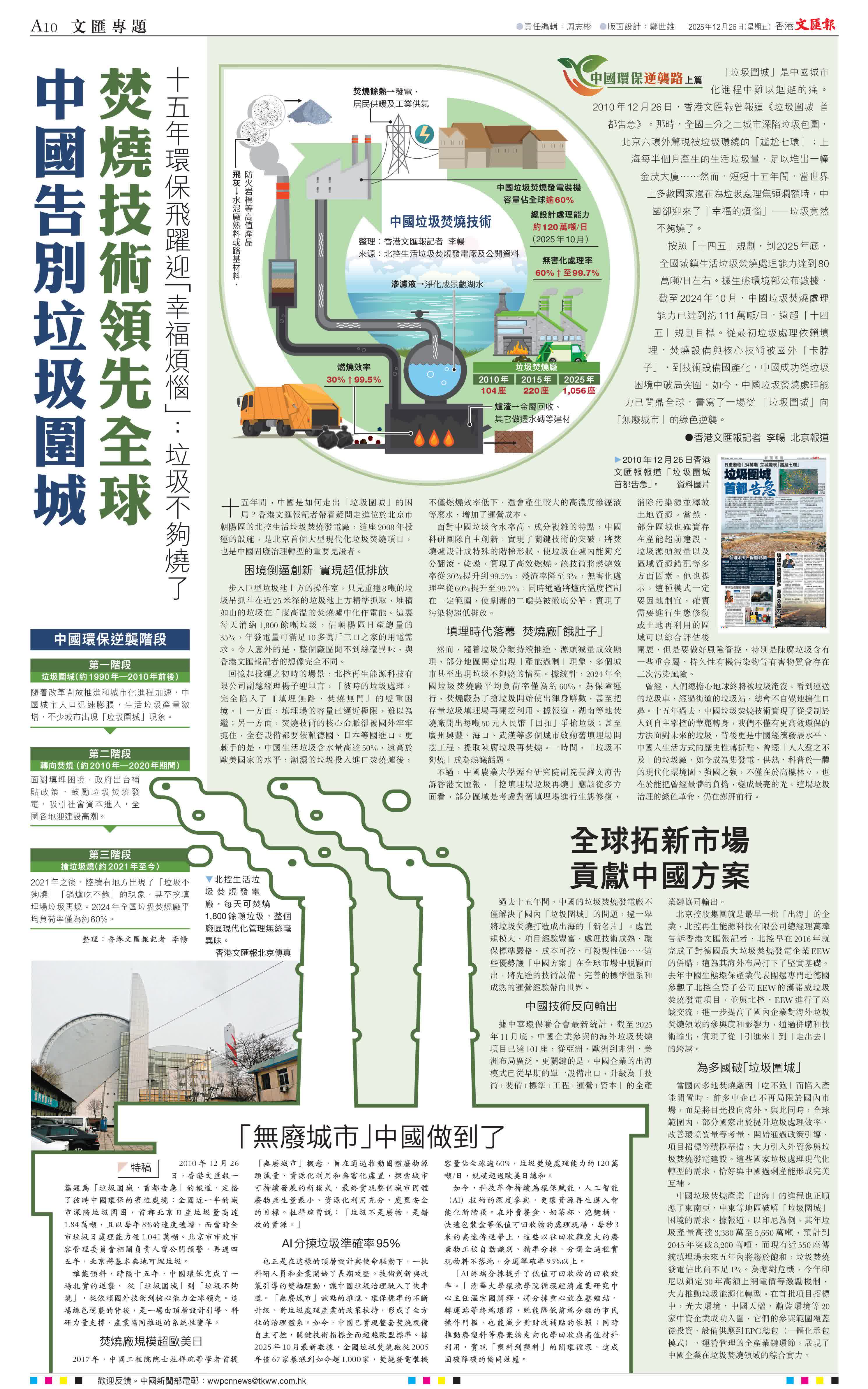 (香港文匯報記者 李暢 北京報道)「垃圾圍城」是中國城市化進程中難以迴避的痛。2010年12月26日,香港文匯報曾報道《垃圾圍城 首都告急》。那時,全國三分之二城市深陷垃圾包圍,北京六環外驚現被垃圾環繞的「尷尬七環」;上海每半個月產生的生活垃圾量,足以堆出一幢金茂大廈……然而,短短十五年間,當世界上多數國家還在為垃圾處理焦頭爛額時,中國卻迎來了「幸福的煩惱」—垃圾竟然不夠燒了。