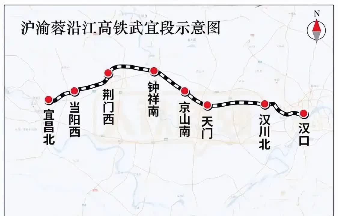 滬渝蓉沿江高鐵武宜段位於湖北省境內,起自武漢市,經天門市、荊門市,終至宜昌市,線路正線全長314公里。除了漢口、荊門西站外,漢川北、天門、京山南、鍾祥南、當陽西、宜昌北6站均為新建車站,讓鍾祥、京山、當陽等多個城市首次邁入高鐵時代。