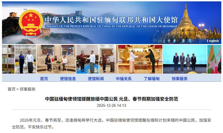 2026年元旦、春節將至,適逢緬甸將舉行大選,12月26日,中國駐緬甸使領館發文提醒在緬和計劃來緬的中國公民,加強安全防範,平安快樂過節。