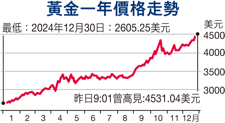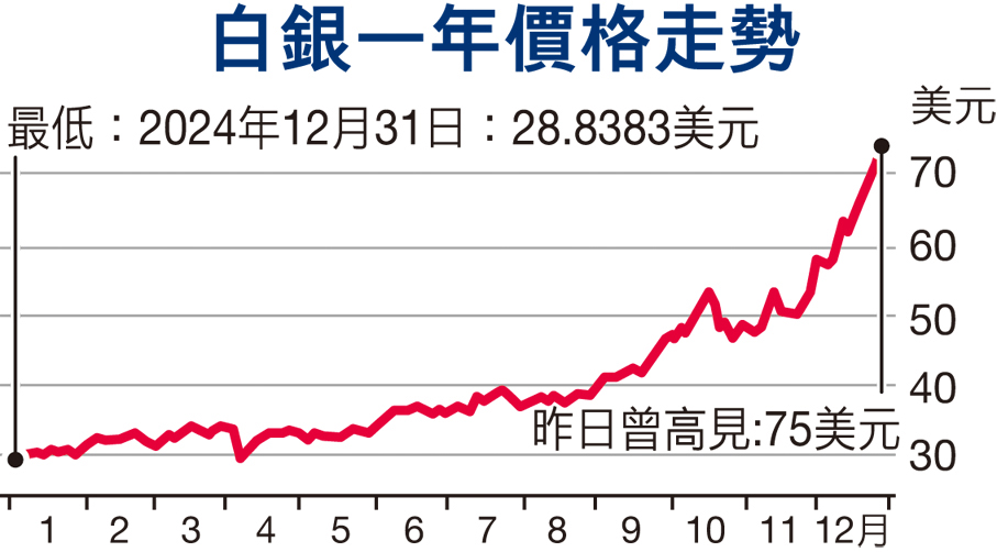 地緣政治緊張局勢持續以及對美國明年進一步減息的押注增加,推動貴金屬市場歷史性上漲。黃金和白銀周五齊創歷史新高,其他貴金屬鉑金和鈀金也同步上揚。現貨黃金一度觸及每盎司4,530美元以上的新高,現貨白銀價格連續五個交易日上漲,並首次觸及每盎司75美元。今年迄今,黃金價格已上漲約72%,白銀價格上漲超過158%,均有望創下自1979年以來的最佳年度表現。市場分析,近期地緣政治不確定性顯著提升了市場避險情緒與囤貨意願,並繼續看好明年貴金屬走勢。有分析師預估明年上半年黃金或有機會突破5,000美元,白銀有潛力達到每盎司90美元左右。
