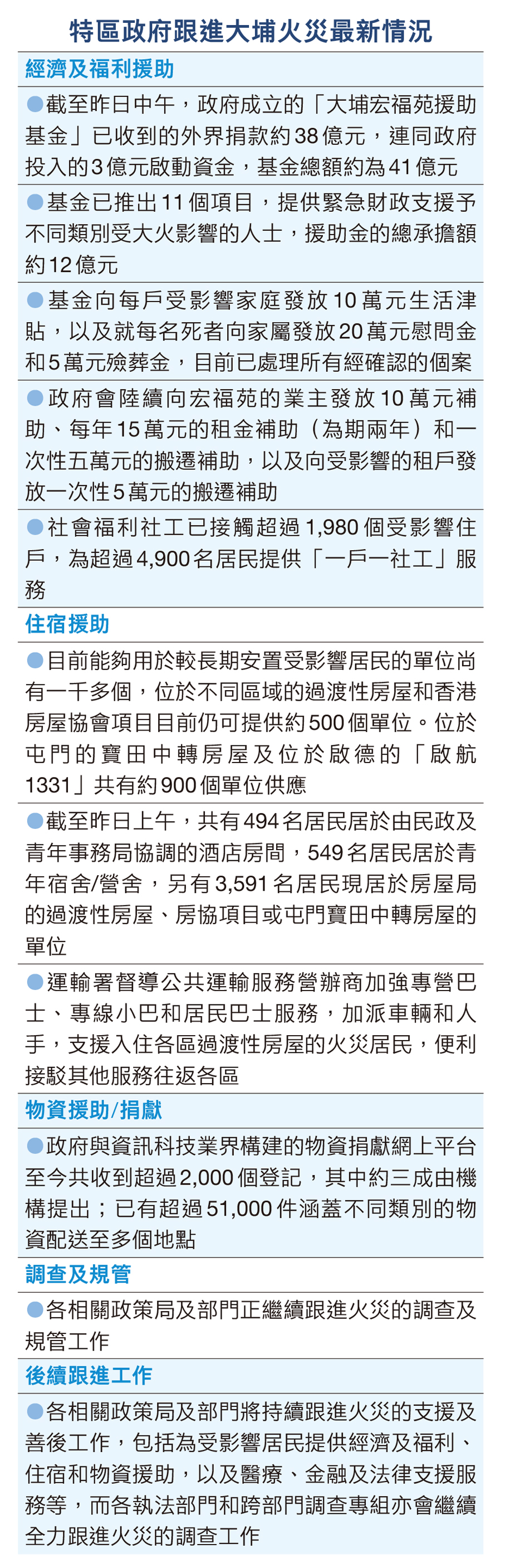 李家超在帖文中介紹,在大火發生後,多個慈善團體及基金迅速撥出善款幫助居民。政府亦成立「大埔宏福苑援助基金」,至今收到約38億元捐款,連同政府投入的3億元啟動資金,基金總額約為41億元,為不同類別的受火災影響人士,包括所有住戶、死難者家屬、留院傷者、學生、外傭、工友、業主和租戶,提供各種緊急財政支援。