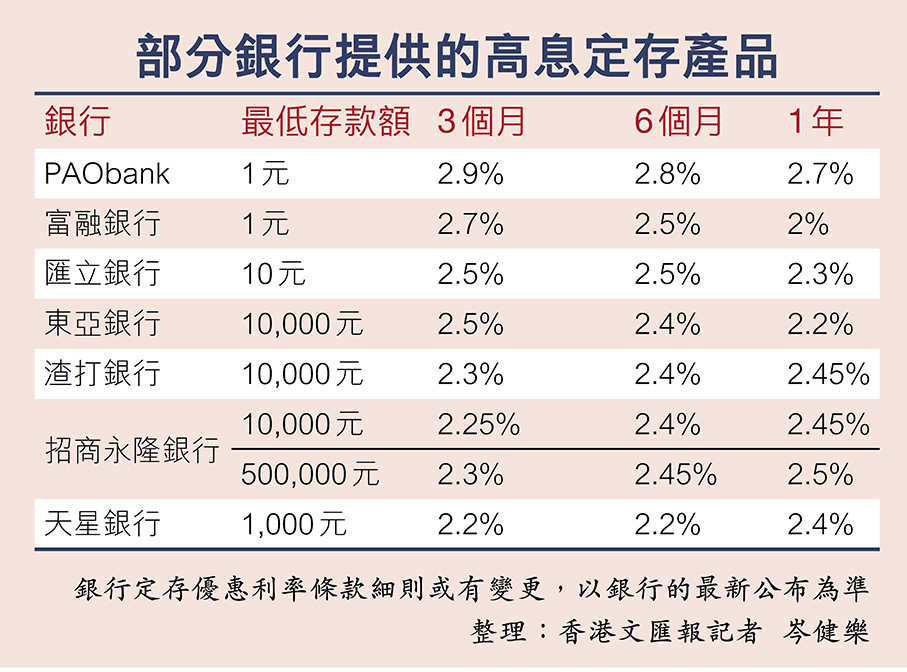 以1萬港元敘造12個月定期存款為例,PAObank的定存利率最高,年利率達2.7厘,其次為渣打銀行與招商永隆銀行,年利率都是2.45厘,天星銀行與匯立銀行則緊隨其後,年利率都是2.4厘。同樣1萬港元敘造3個月定期存款,PAObank的定存利率最高,年利率達2.9厘,其次為富融銀行,年利率為2.7厘。