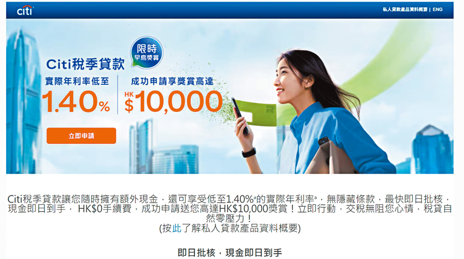 另一方面,很多人以為稅貸只可以用來交稅,其實不是。有些人會借稅貸作投資或其他用途,因為稅務貸款的利息一般較私人貸款平。不過大家要留意,稅貸還款期比較短,而且現時市況持續波動,所以各位打工仔申請稅貸時,最重要的還是量力而為,包括事先衡量一下自己的還款能力是否足夠,還得到先好借!