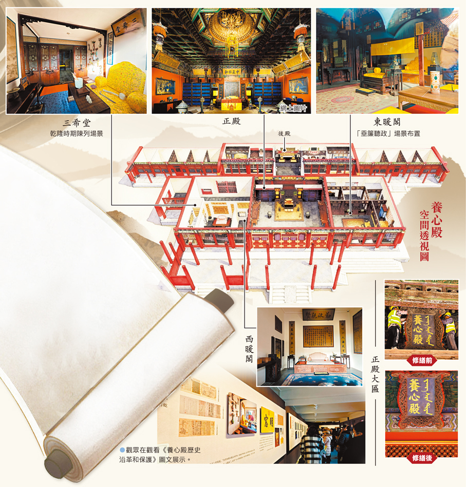 經過近10年的研究性保護和系統性修繕,故宮養心殿26日重新開放。養心殿是清代八位皇帝的「起居辦公室」,這裏的原狀陳列,保留了雍正、乾隆、同治、光緒不同時期的原狀,共計布陳展品1,020件。香港文匯報記者在現場看到,室內原狀陳列的布展遵循歷史原貌,正殿寶座上方懸掛雍正御筆「中正仁和」匾,西暖閣「勤政親賢」匾額下的楹聯恢復如初,三希堂內則按記載還原了乾隆時期的陳列場景。另外,針對古建展廳光照難題,故宮科研團隊研究光纖調光系統,在保障文物安全的前提下優化觀眾觀展體驗。