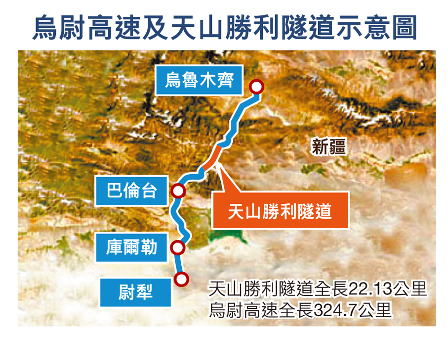 綿延2,500公里的天山山脈橫亘新疆中部,分隔北疆最大城市烏魯木齊和南疆重鎮庫爾勒。烏尉高速通車後,南北疆兩大城市通行時間可從7小時縮至3.5小時,將推動新疆經濟南北暢通,構建對外交流新通道。
