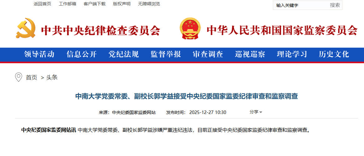 據中央紀委國家監委網站消息,中南大學黨委常委、副校長郭學益涉嫌嚴重違紀違法,目前正接受中央紀委國家監委紀律審查和監察調查。