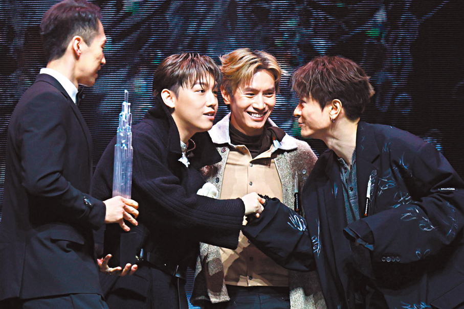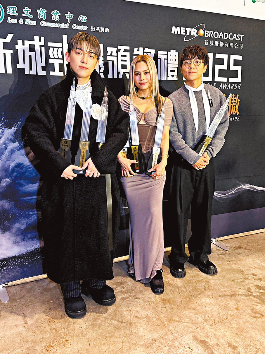 香港文匯報訊(記者 子棠、達里)本年度樂壇第一張成績表《新城勁爆頒獎禮2025》昨日於會展舉行,大會主題今年是「我們的驕傲」,邀請了多位體育界運動員及精英擔任頒獎嘉賓。林家謙、李幸倪與張天賦成為頒獎禮的大贏家,各獲得3個獎,泳兒、魏浚笙、洪嘉豪及陳柏宇也分別獲得兩個半獎。唱片公司方面,英皇合共捧走15個獎項,以半個獎之微僅勝獲得14個半獎的華納唱片。而日前上載與劉展霆親密照的鍾柔美(Yumi),洩「蜜」後成為焦點,昨日與姚焯菲獲安排站在薛家燕身後的中間位置,更奪得「勁爆躍進女歌手」金獎。