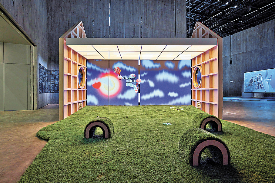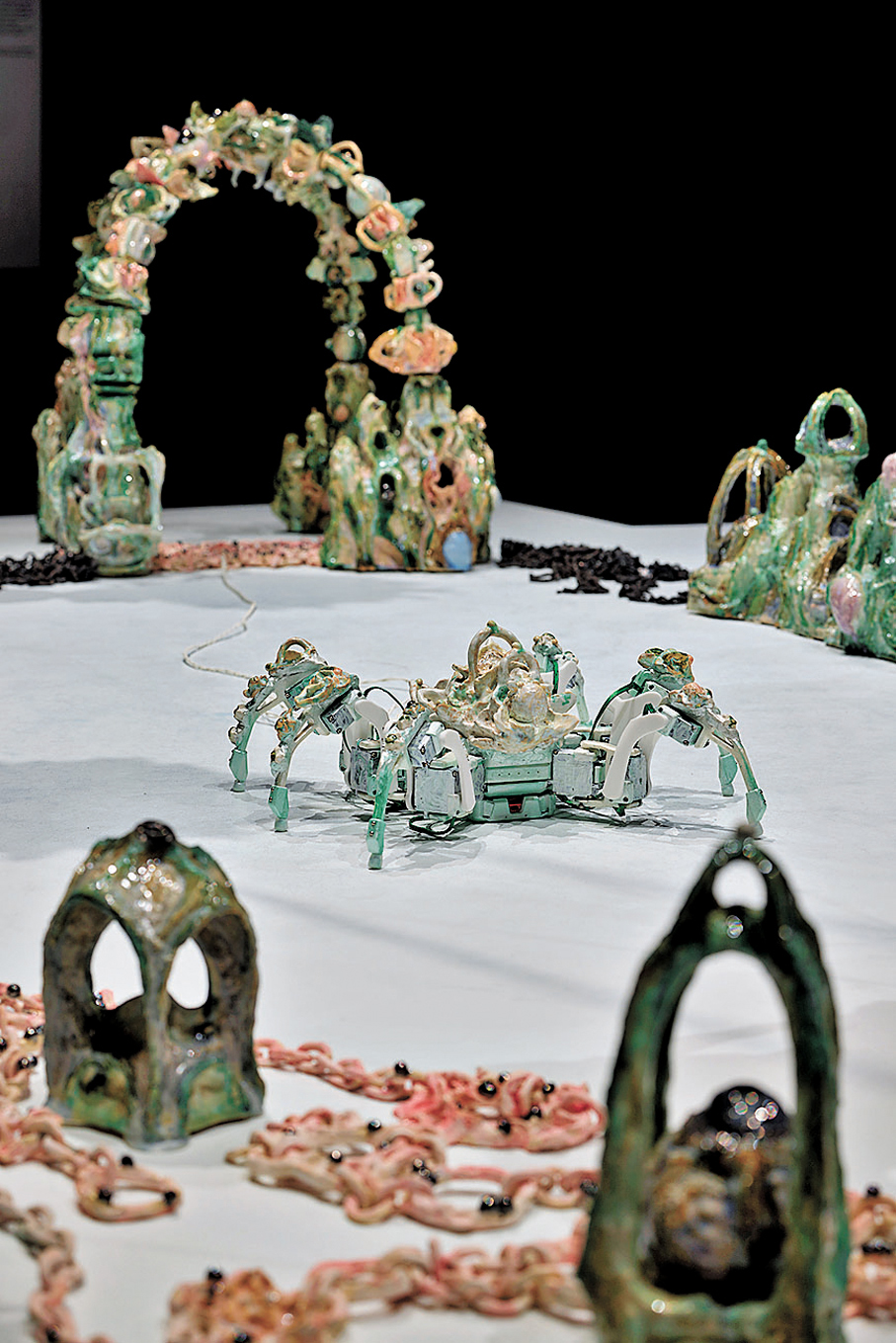 在本次展覽中,劉慧德創作的大型陶瓷雕塑裝置《宇宙藍圖》(2025)聚焦一隻結合了陶瓷與器械元素的機械蜘蛛。作品靈感源自中國古籍《山海經》及藝術家曾經歷的喪親之痛,展現了她如何敏於把控材料、構建空間,藉此將哀悼轉化為一種共同經驗。黃炳的錄像裝置《風避賭債去》(2025)則呈現了一個趣味十足的迷你劇場,當中飾以人造草皮、長滿毛髮的高爾夫球和旗杆。他獨特的動畫語言和機敏的幽默感,讓觀眾徜徉於多重敘事並行、奇思妙想的世界中,同時反思當下時代。