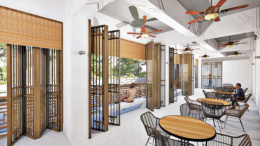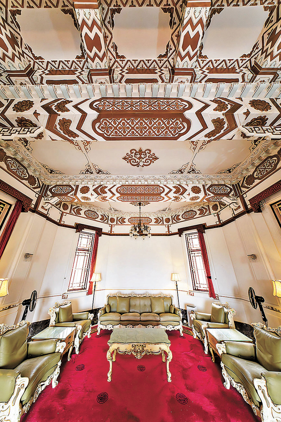 吳的欣補充,主樓屋頂以中式琉璃瓦片鋪砌,是傳統的歇山式設計,屋脊上的寶珠、正吻、垂獸、仙人、走獸等裝飾則採用較抽象簡化的「博古」紋飾設計,屋簷斗拱、額枋、雀替等中式裝飾,配以俗稱意大利批盪的彩色水磨石飾面,中西合璧渾然天成。主樓天花金漆灰塑橫樑具華麗視覺效果,地面鋪以大理石地磚、木地板,並有馬賽克嵌砌的圖案,窗戶配有彩色玻璃、花崗石窗框和中式圖案的金屬窗芯。