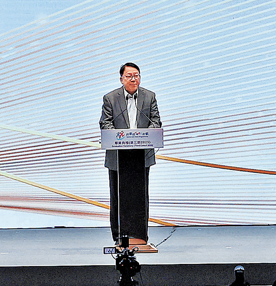 香港文匯報訊(記者 盧慧穎)共創明「Teen」計劃第三期畢業典禮昨日舉行,特區政府政務司司長陳國基出席並致辭,他表示,很開心有些大型公司願意將來待學員適齡工作時會得到優先聘請機會,他鼓勵各界校友在畢業後,要積極參加校友會活動,以擴展人際網絡、延續計劃成效。有學員表示,參與此計劃不僅提升自信與勇氣,友師亦為他們提供了多元的職業規劃建議。