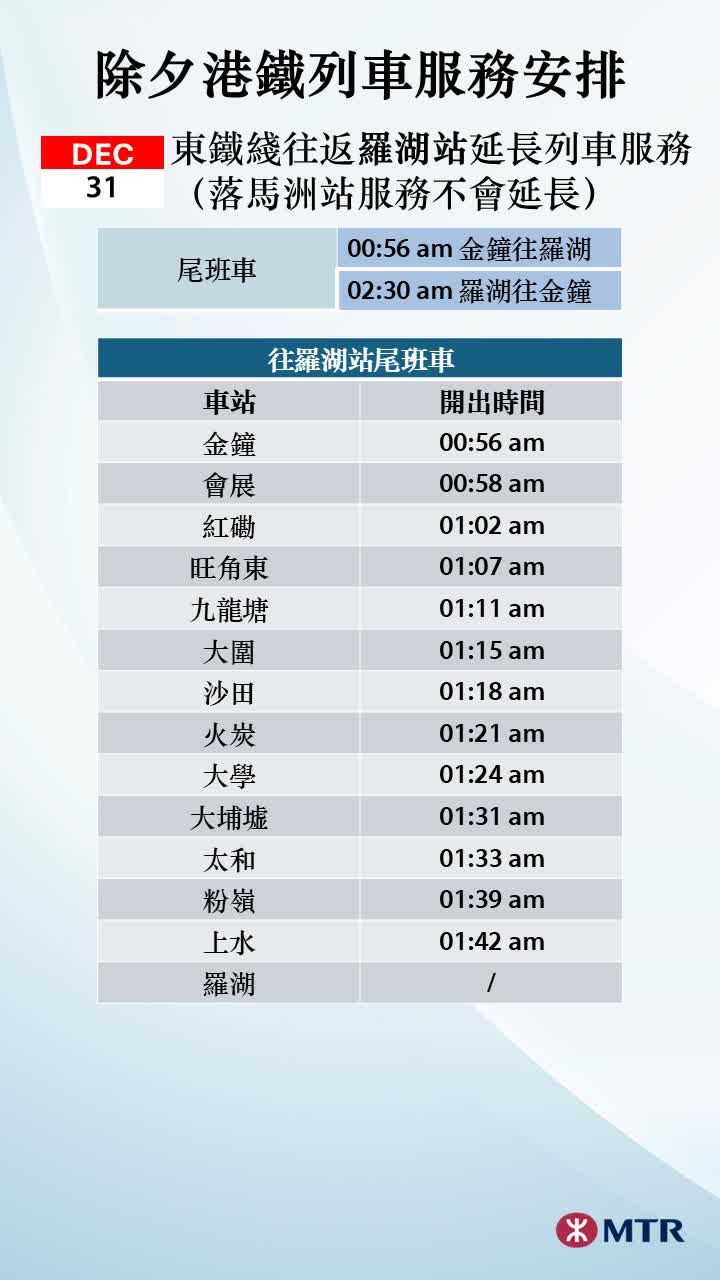 為配合除夕羅湖口岸延長服務時間,當晚東鐵綫來往羅湖站的過境列車服務亦會相應延長,前往羅湖站的尾班車會於凌晨0時56分於金鐘站開出。(見圖一及圖二)