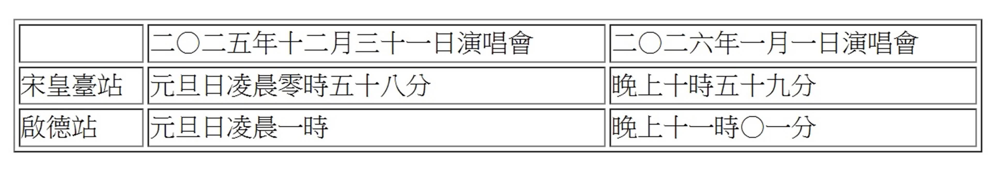 署方表示,根據主辦單位的資料,兩場演唱會預計分別於元旦日凌晨零時30分及晚上10時半完結,計劃即日返回內地的觀眾需特別注意前往各口岸的班次服務時間: