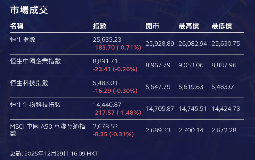 香港文匯報訊 港股假後復市,三大指早市一度衝高,惟隨後沽壓增加,收市錄稍跌。恒生指數早市曾高見26,082點;收報25,635點,全日跌183點或0.71%。國企指數跌0.26%。恒生科技指數跌0.30%。大市成交約2,245億元。