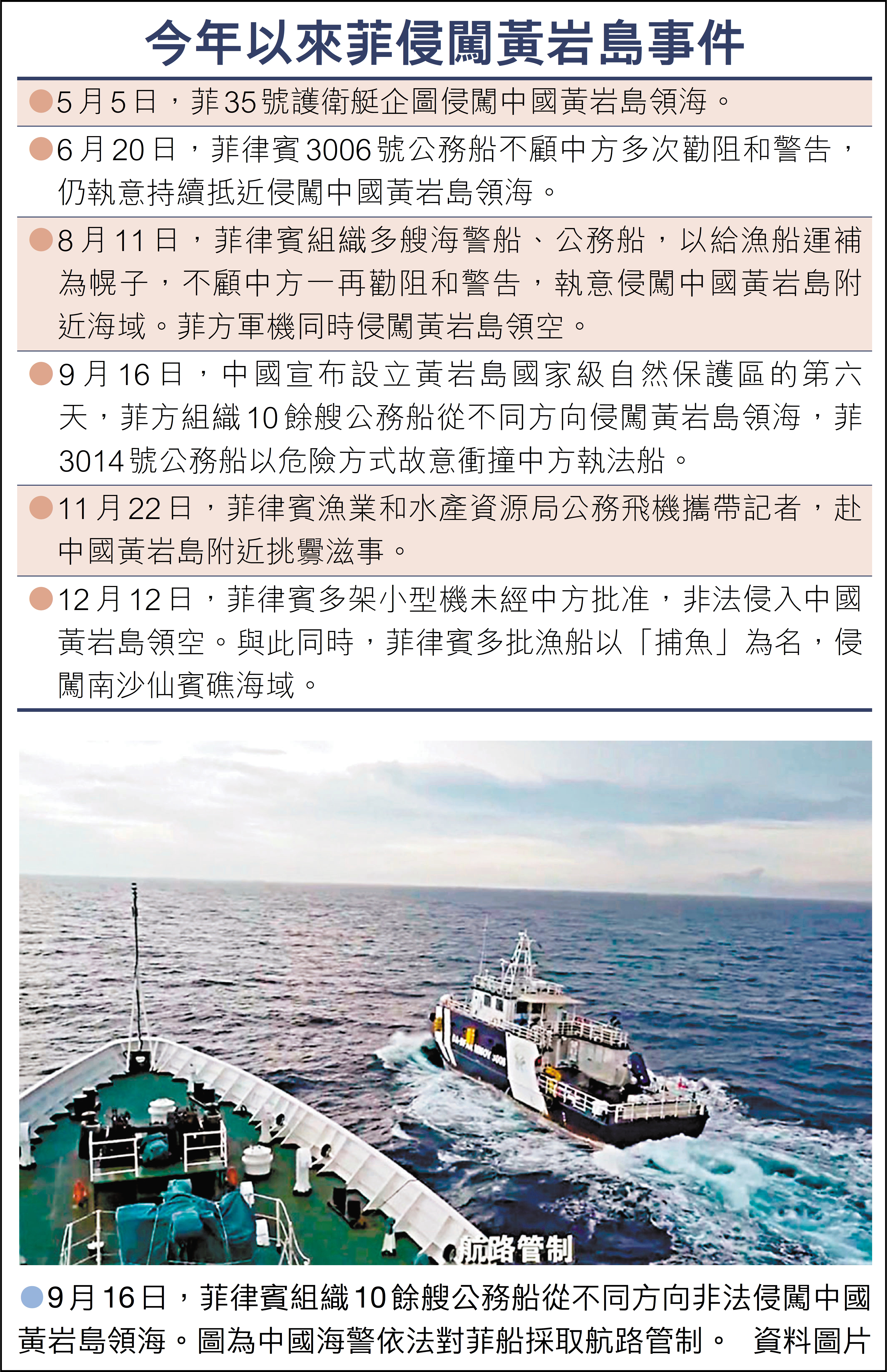 同時,近年來菲律賓非法捕撈和頻繁侵闖活動也對黃岩島生態系統健康造成了很大威脅。《報告》稱,中國海警、原中國海監多次發現大量菲律賓船隻在黃岩島海域聚集並實施非法捕撈,僅2013年-2018年驅離的菲律賓非法漁船就達900餘艘、處置菲律賓棄置浮筒30餘個。2016年5月18日衛星遙感影像顯示,有20餘艘菲律賓漁船在黃岩島海域活動,該時段正處於中國南海伏季休漁期。菲律賓還頻繁組織大量船舶侵闖黃岩島海域,衝撞中國船舶,據不完全統計,2024年至今菲律賓侵闖活動達14次,尤其是2025年9月中國黃岩島國家級自然保護區設立後,菲律賓侵闖活動規模和頻率進一步加大。2025年現場調查發現帶有菲律賓生產標識的棄置物,以及菲律賓棄置的漂浮裝置,裝置下方用於固定的繩索和鐵塊在海流作用下對固定處及周邊珊瑚造成直接破壞。