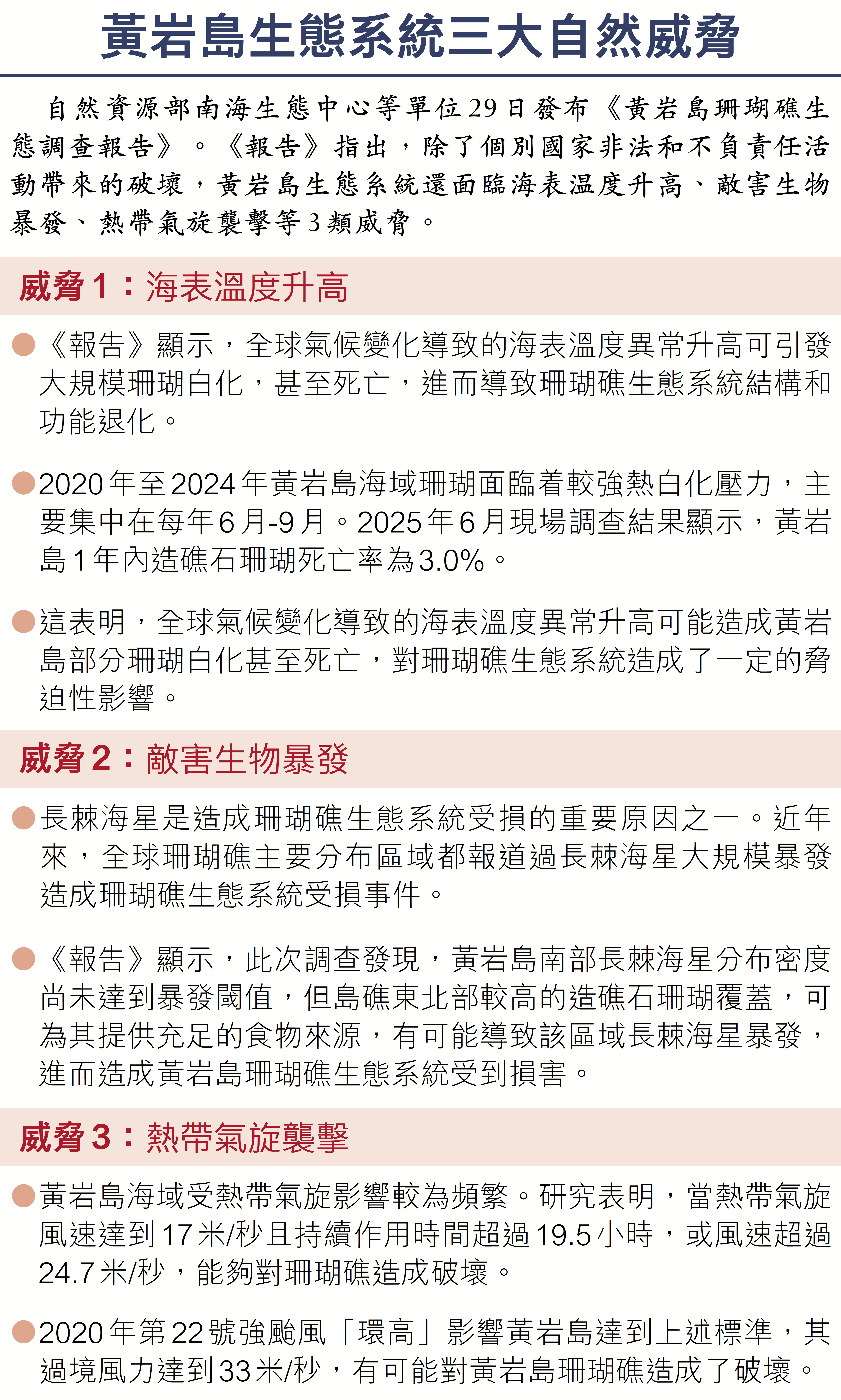 香港文匯報訊(記者 王玨 北京報道)自然資源部南海生態中心等單位29日發布《黃岩島珊瑚礁生態調查報告》。《報告》顯示,黃岩島珊瑚礁生態系統狀況總體良好,黃岩島國家級自然保護區範圍內造礁石珊瑚平均覆蓋率高達38.8%。據資料顯示,20世紀60年代至70年代菲律賓在黃岩島海域開展投彈訓練等軍事活動,對黃岩島珊瑚礁造成了破壞。同時,近年來菲律賓非法捕撈和頻繁侵闖活動對黃岩島生態系統健康造成了很大威脅。
