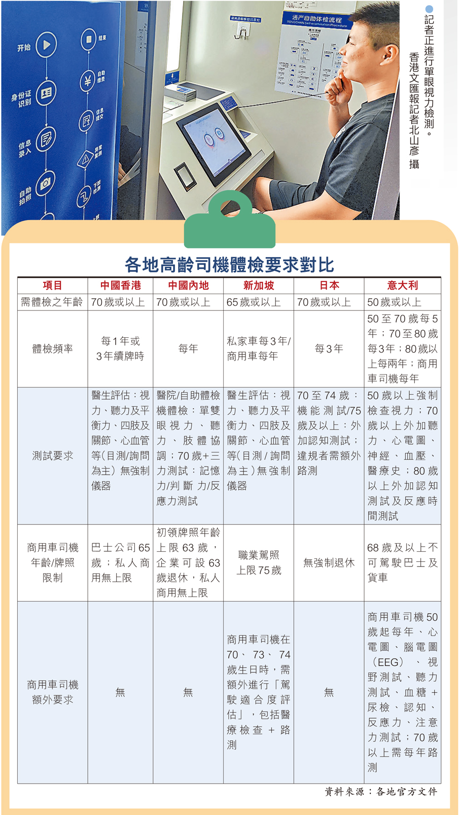 環觀內地的經驗,早於2022年將司機體檢標準化及細化,而且不光是年長(70歲以上)司機有較嚴謹的體檢要求,其他年齡層的司機續領駕駛執照時,也要通過健康檢查。以深圳為例,已推出自助體檢制度,由機器或醫護負責檢驗申請人的機能及反應,申請人可透過深圳公安微信公眾號預約,多個交管所均提供服務,人流較少的站點更支援即日排隊;醫院體檢同樣支援微信或App預約,確認名額後可即日前往。