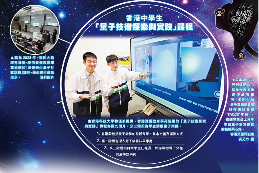 量子理論因為抽象深奧,常被視為「高不可攀」的尖端科學。在香港現行教育體系中,量子知識的普及仍處於萌芽階段,惟其獨特魅力,其實亦可融入更多青少年的學習中,助他們迸發出如「量子態」般的無限潛能。在特區政府資優教育基金推動下,本港中學生近年亦透過資優量子課程,由淺入深認識量子技術原理與應用,從人才培育與教育創新層面,為國家科技強國與未來產業之路積蓄動能。有就讀課程的香港高中生,早前更獲推薦出席國際量子學術會議匯報學習成果,有機會接觸各地優秀的量子科學家及汲取靈感。他們期望能繼續深入鑽研,在未來的量子新紀元,寫下香港新一代的篇章。