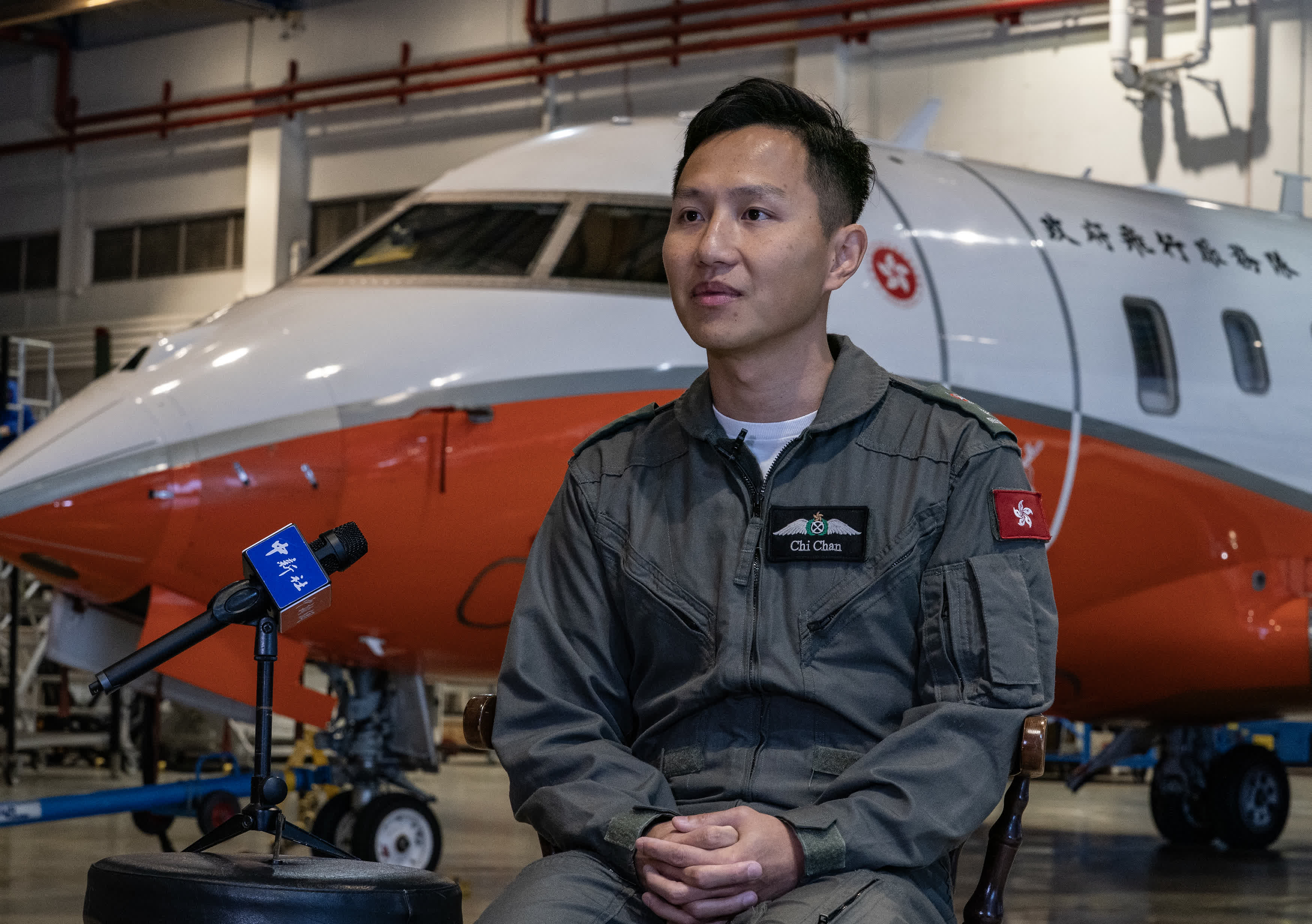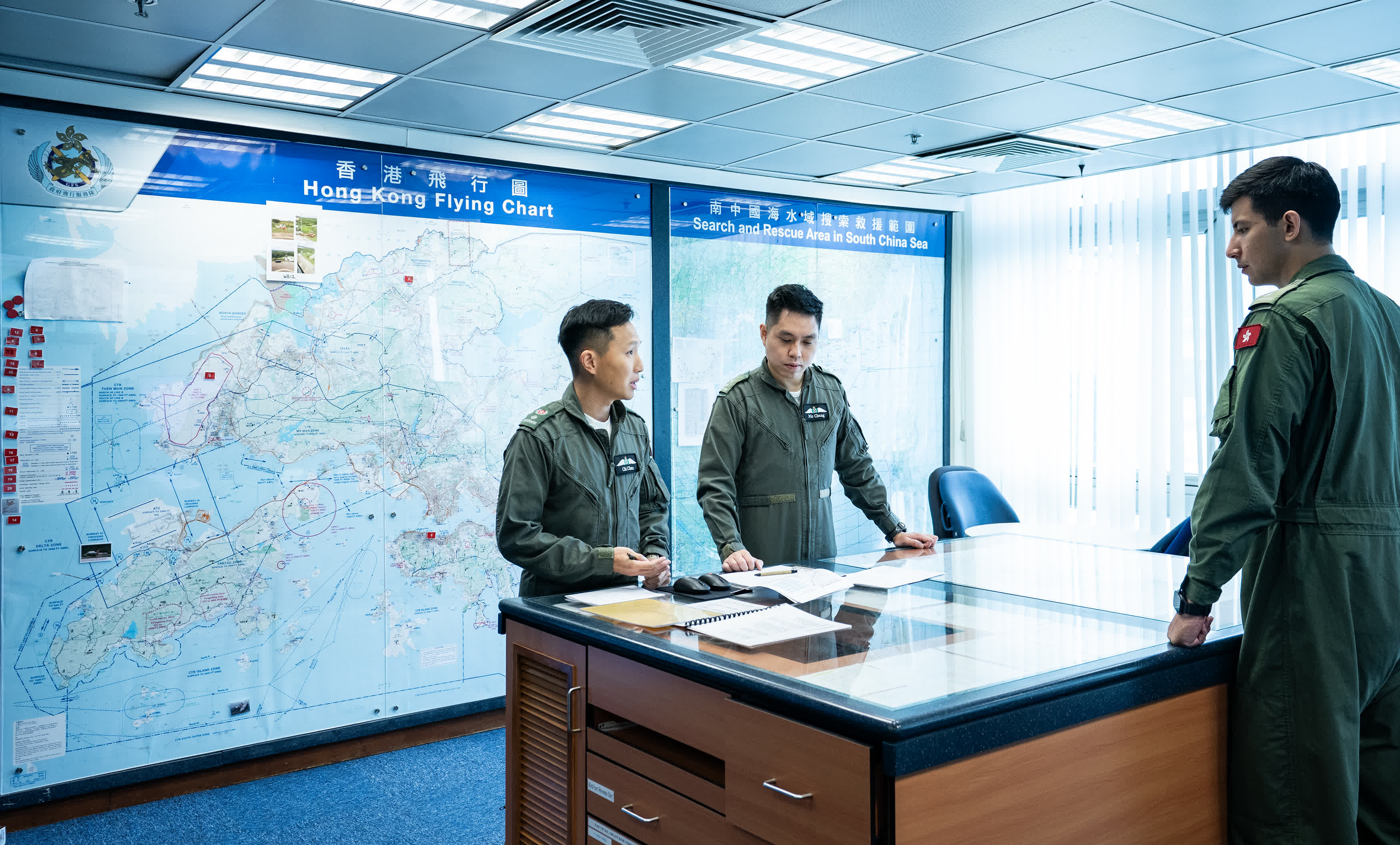 毗鄰機場的香港特區政府飛行服務隊總部機庫內,閘門緩緩開啟,一架橙色定翼機被拖至停機坪,整裝待發;二樓會議室內,飛行服務隊副經理(飛行行動)、定翼機機長陳永熾正與兩名隊員就此次「追風」任務作最後簡報。