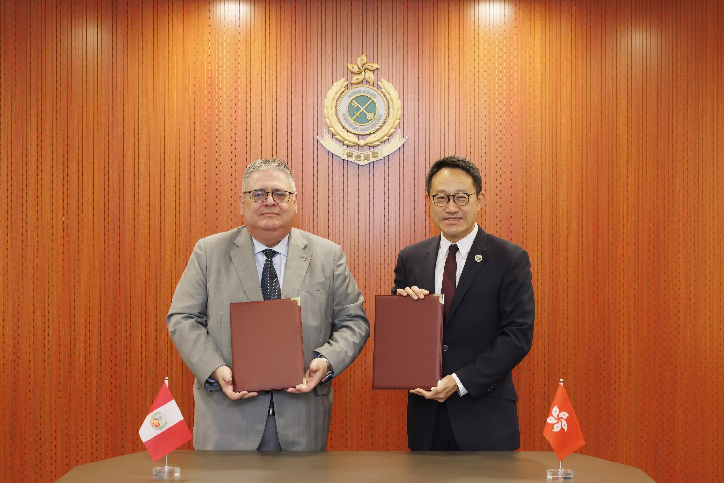 香港文匯報訊(記者 蕭景源)海關關長陳子達今日(30日)在香港海關總部大樓以線上線下模式簽訂香港海關與秘魯海關稅務總局關於各自「認可經濟營運商(AEO)計劃」的互認安排,秘魯駐港總領事Enrique Carlos Cardenas Arestegui親身到場出席簽署儀式,而秘魯海關稅務總局局長Javier Franco Castillo及秘魯海關稅務總局副局長Carlos Adrianzen則在線上見証整個過程。簽署完畢後,陳子達隨即與Enrique Carlos Cardenas Arestegui交換簽署文本。